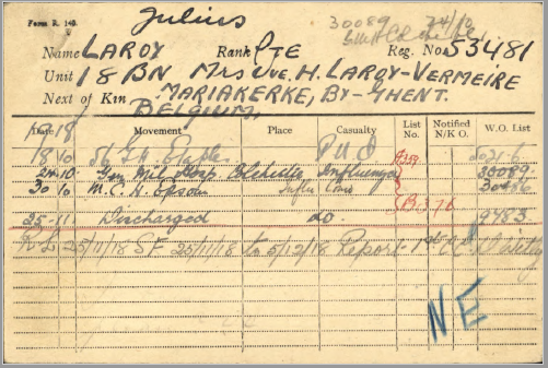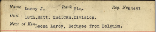 Laroy (Leroy), Juluis: Service no. 53481 Digitized Service Record Source: War Diary. Was spelled “Leroy” in entry. Find-A-Grave Family Search Belgian. Note location of this soldier’s next of kin. Share this: Click to email a link to a friend (Opens in new window) Email Click to share on Facebook (Opens in new window) Facebook Click to share on X (Opens in new window) X Click to share on Reddit (Opens in new window) Reddit Click to share on LinkedIn (Opens in new window) LinkedIn Click to print (Opens in new window) Print Click to share on Tumblr (Opens in new window) Tumblr Click to share on Pocket (Opens in new window) Pocket Click to share on Pinterest (Opens in new window) Pinterest Click to share on Telegram (Opens in new window) Telegram Click to share on WhatsApp (Opens in new window) WhatsApp Like Loading... Leave a comment Cancel reply Δ This site uses Akismet to reduce spam. Learn how your comment data is processed.