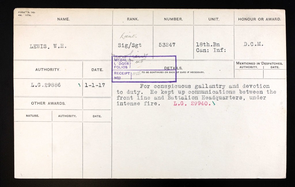 Distinguished Conduct Medal per London Gazette no. 29886, page 51. 29 December 1916. Date is incorrect in service file.