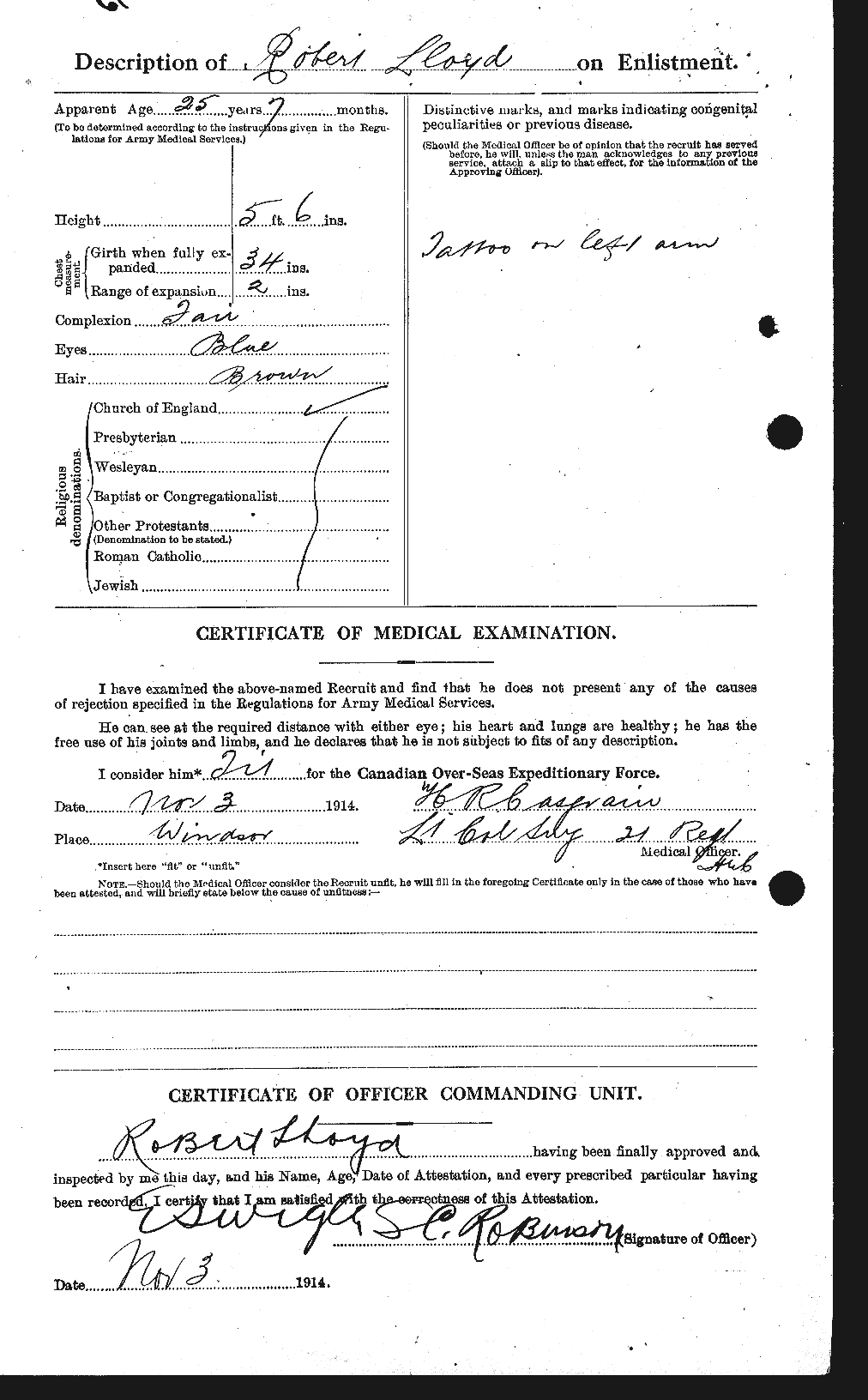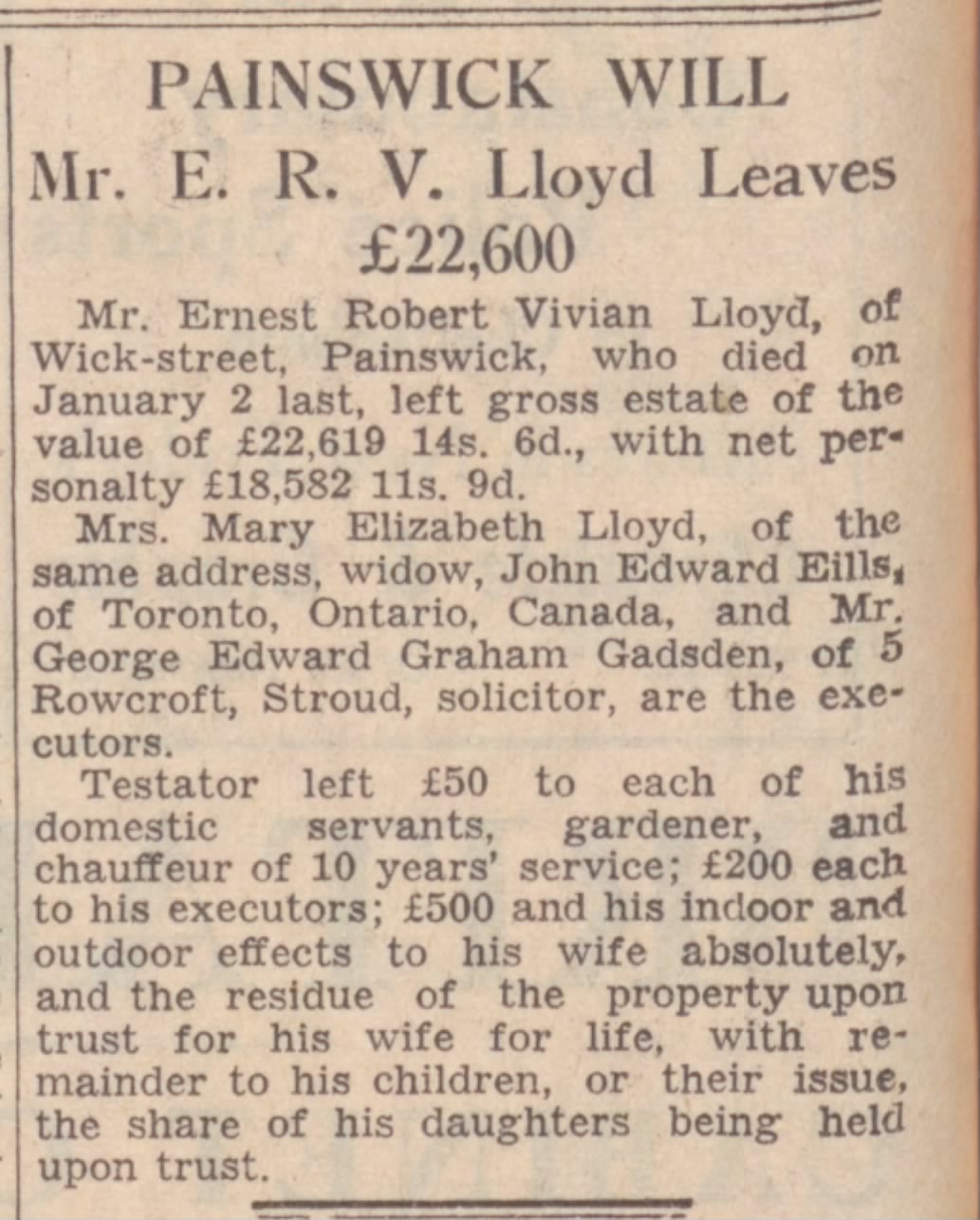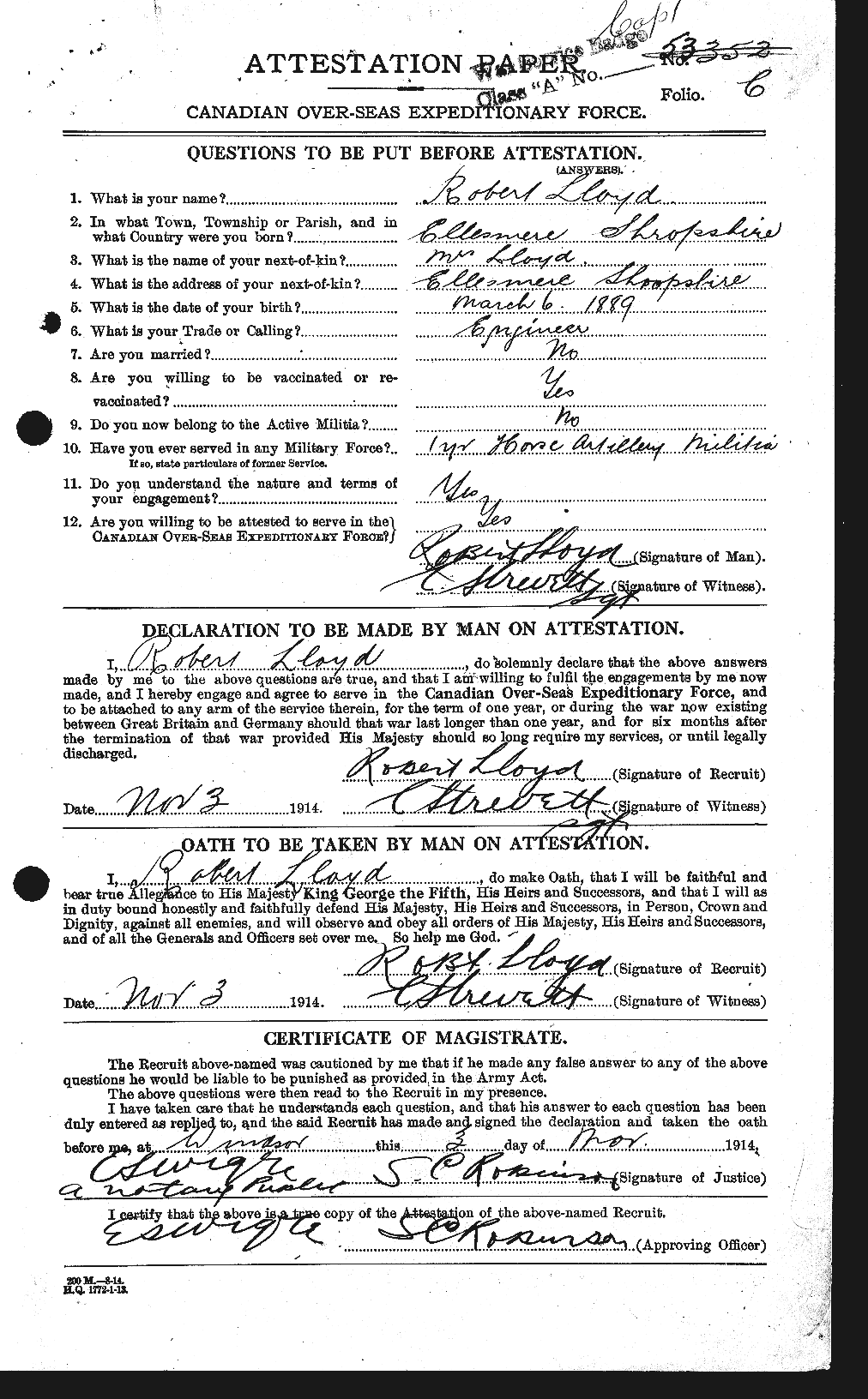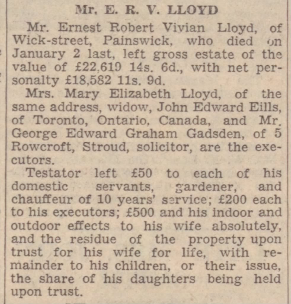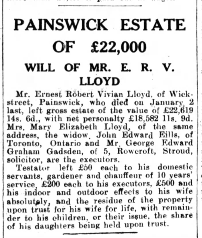 Family Search: When Captain Ernest Robert Vivian Lloyd was born on 6 March 1889, in Shropshire, England, United Kingdom, his father, Robert Edward Lloyd, was 30 and his mother, Annie Laker, was 25. He married Mary Elizabeth Edginton in 1918, in Long Ashton, Somerset, England, United Kingdom. They were the parents of at least 1 son. He immigrated to Canada in 1913 and lived in Heswall, Cheshire, England, United Kingdom in 1901 and Toronto, Ontario, Canada in 1922. He registered for military service in 1914. In 1914, at the age of 25, his occupation is listed as engineer. He died on 2 January 1939, in Gloucestershire, England, United Kingdom, at the age of 49, and was buried in Stroud, Gloucestershire, England, United Kingdom.