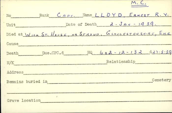 [ii] Lloyd, Ernest Robert Vivian: Service no. 53352 (Capt.)