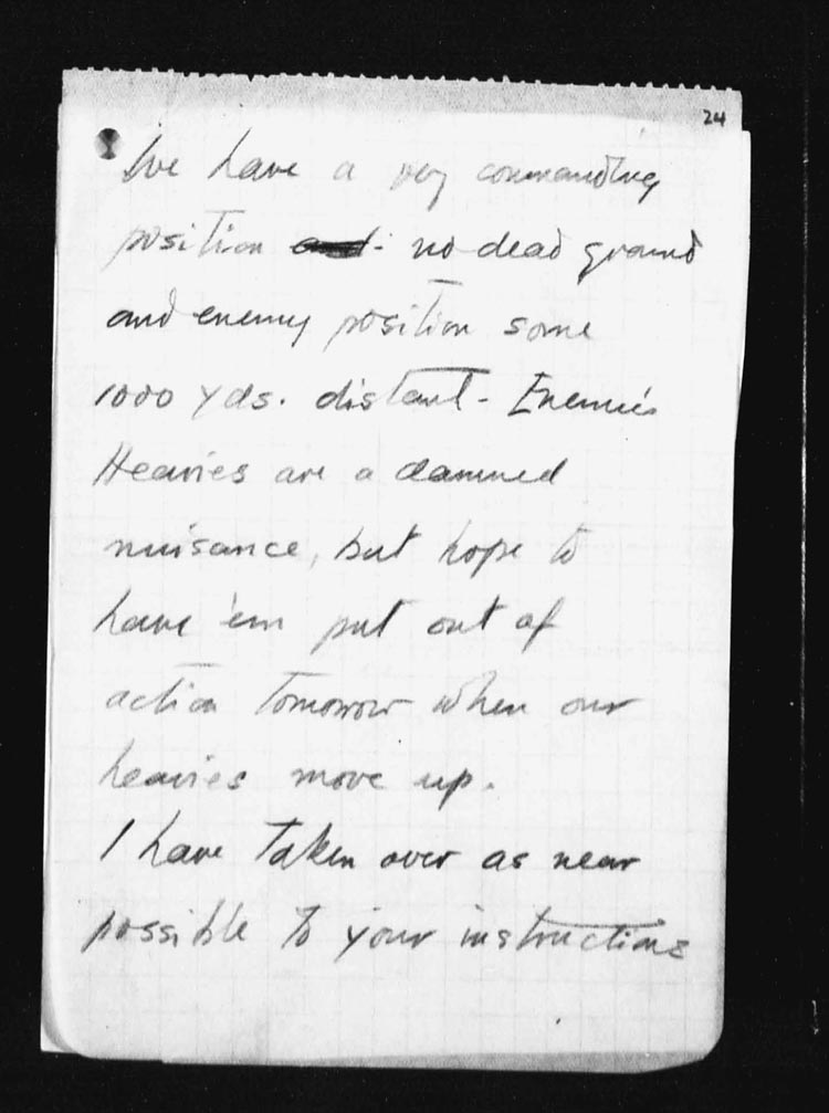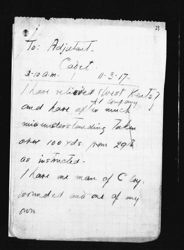 | Message: Am building second line connecting shell holes 50 yards in rear of front line. Mr. Lloyd[ii] with B. Co. is looking after this. I myself have parts of A, C & D companies in front line.[iii] Have one Machine Gun (Boche) but don’t know how to work it. M.G. organization not very good, otherwise everything alright. Have good connection with H.L.I.[iv] on right and 20th Bn. on left. |