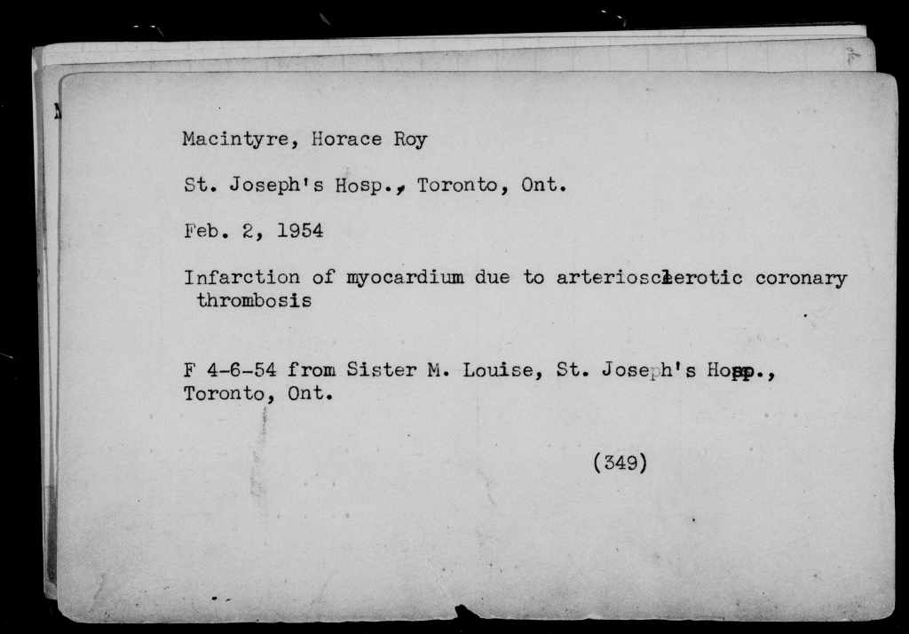 DR. HORACE MacINTYRE, aged 65, chief medical advisor to the Toronto Maple Leafs hockey club, died in St. Joseph’s Hospital, Toronto, on February 2 [1954]. A native of Kincardine, Ont., he was a graduate of the medical school of the University of Toronto. Active in sports from childhood, he managed several of the college’s junior hockey teams. Dr. MacIntyre served overseas as a battalion medical officer in World War 1. On his return he was in charge of the chest clinic at the Christie Street Military Hospital and thousands of veterans passed through his office. Later he went to Sunnybrook Hospital in the same capacity and after his retirement from there he remained active as consultant in chest cases. He was associated with St. Joseph’s Hospital for 30 years. He is survived by his widow, a daughter and a son.