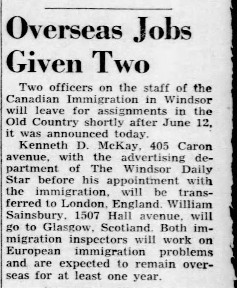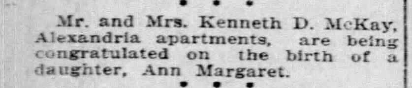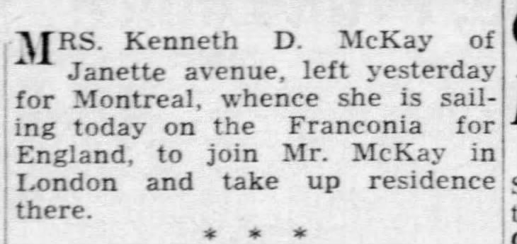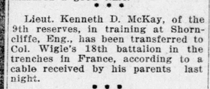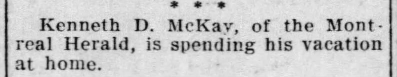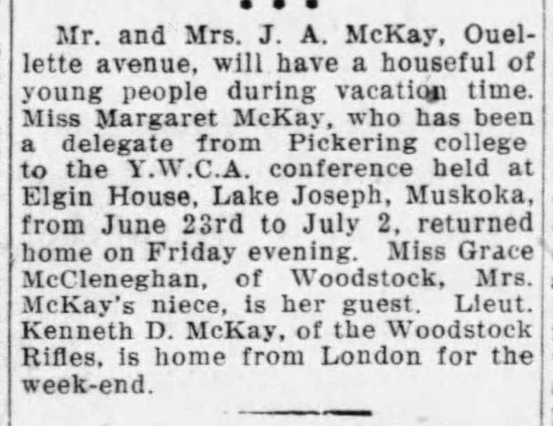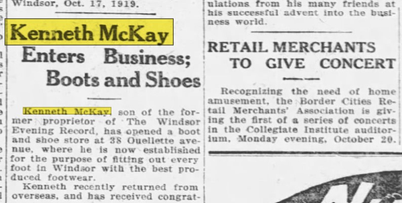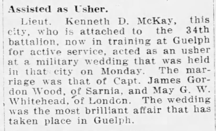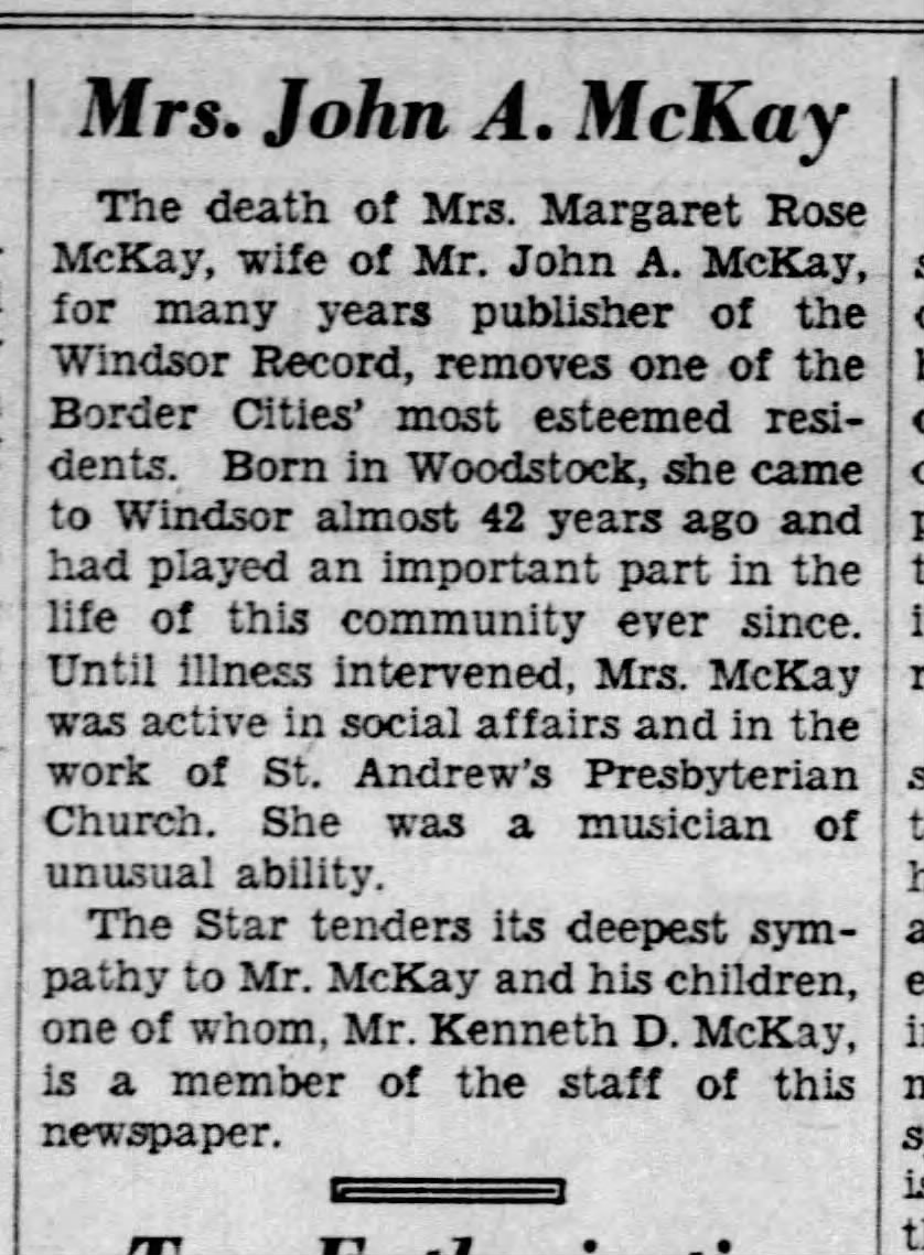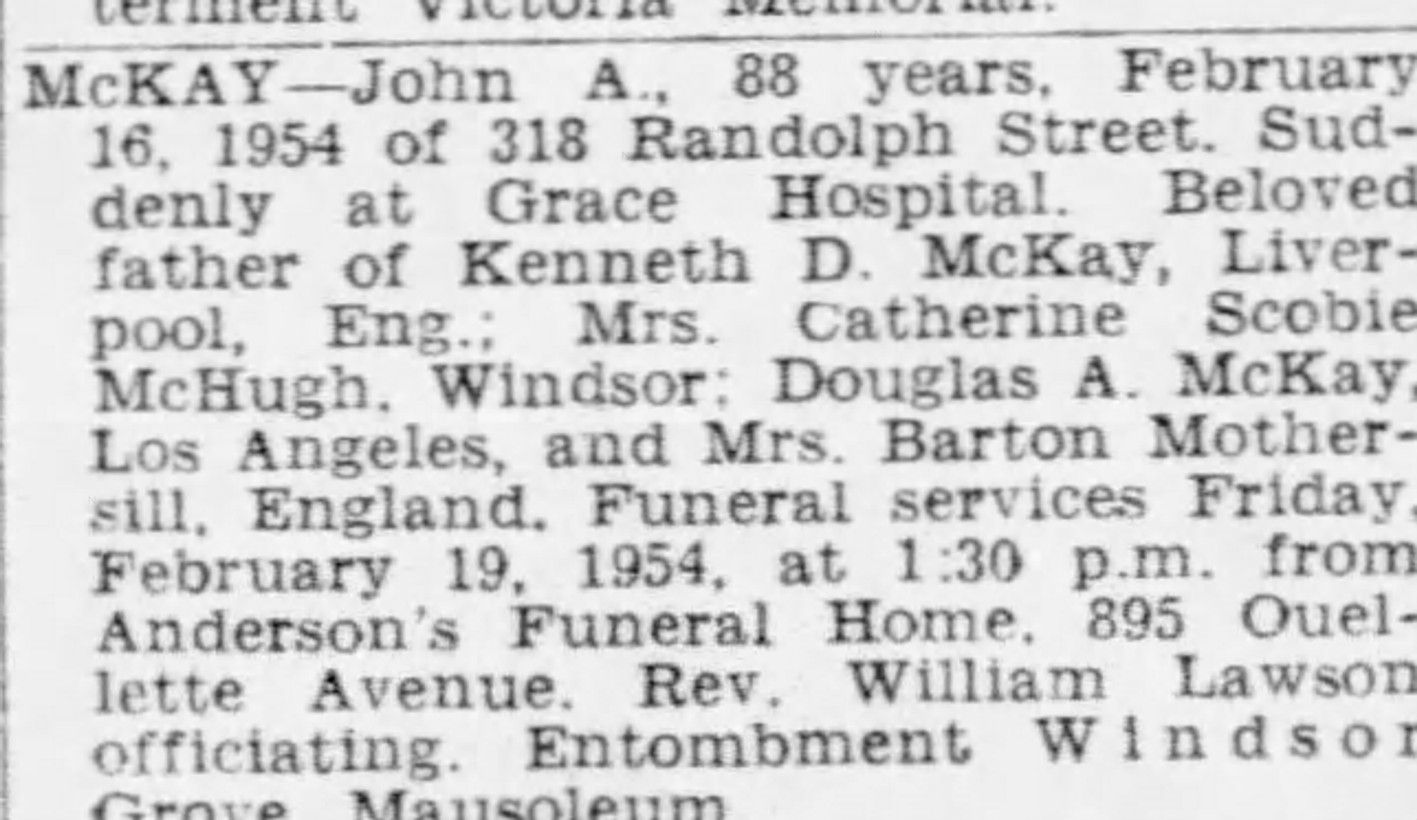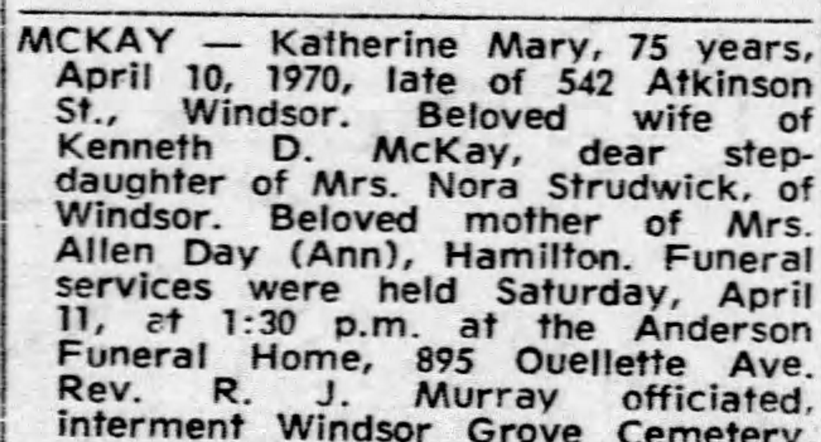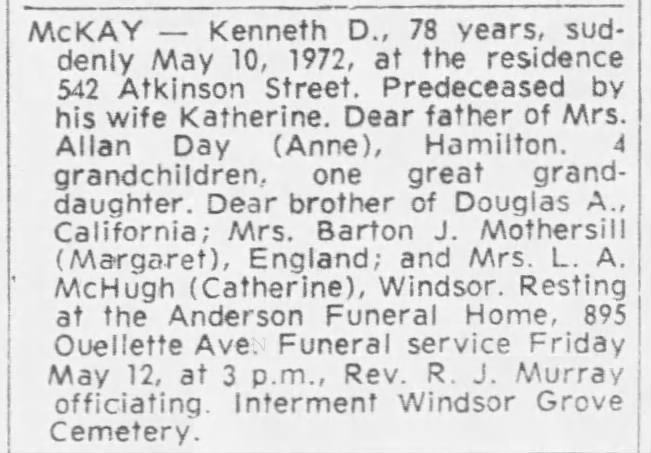 Family Search: When Captain Kenneth Donald McKay was born on 18 September 1894, in Windsor, Essex, Ontario, Canada, his father, John Alexander McKay, was 27 and his mother, Margaret R Brotchie, was 26. He married Katherine Margaret Strudwick in 1918. They were the parents of at least 1 son and 1 daughter. He lived in Ontario, Canada in 1897 and Essex, Ontario, Canada in 1911. He registered for military service in 1914. He died on 10 May 1972, in Windsor, Essex, Ontario, Canada, at the age of 77, and was buried in Windsor Grove Cemetery, Windsor, Essex, Ontario, Canada.