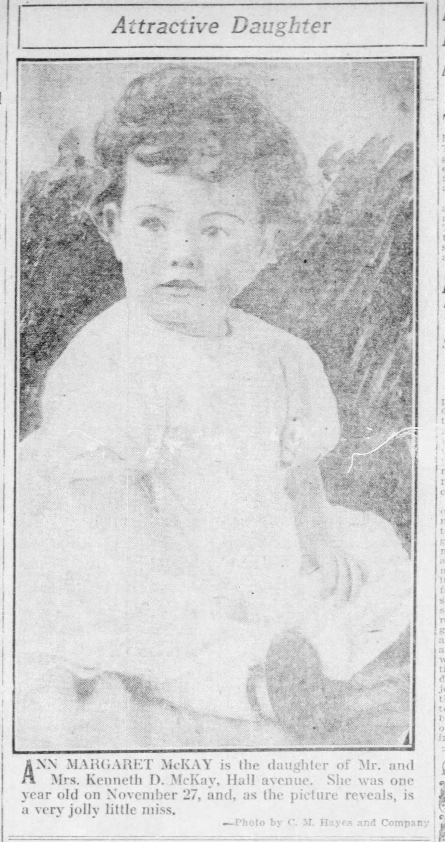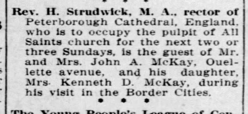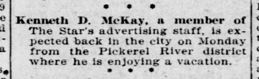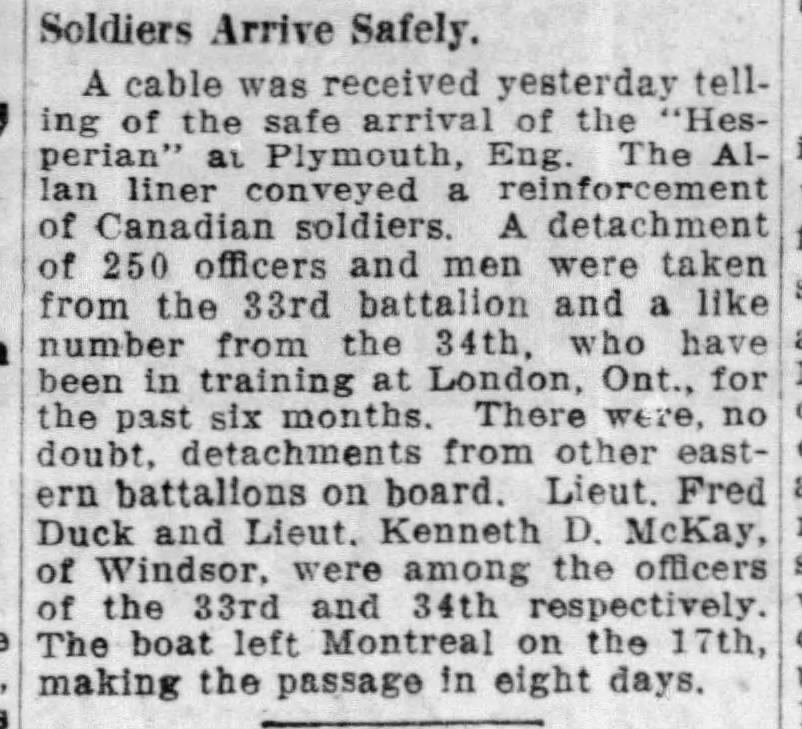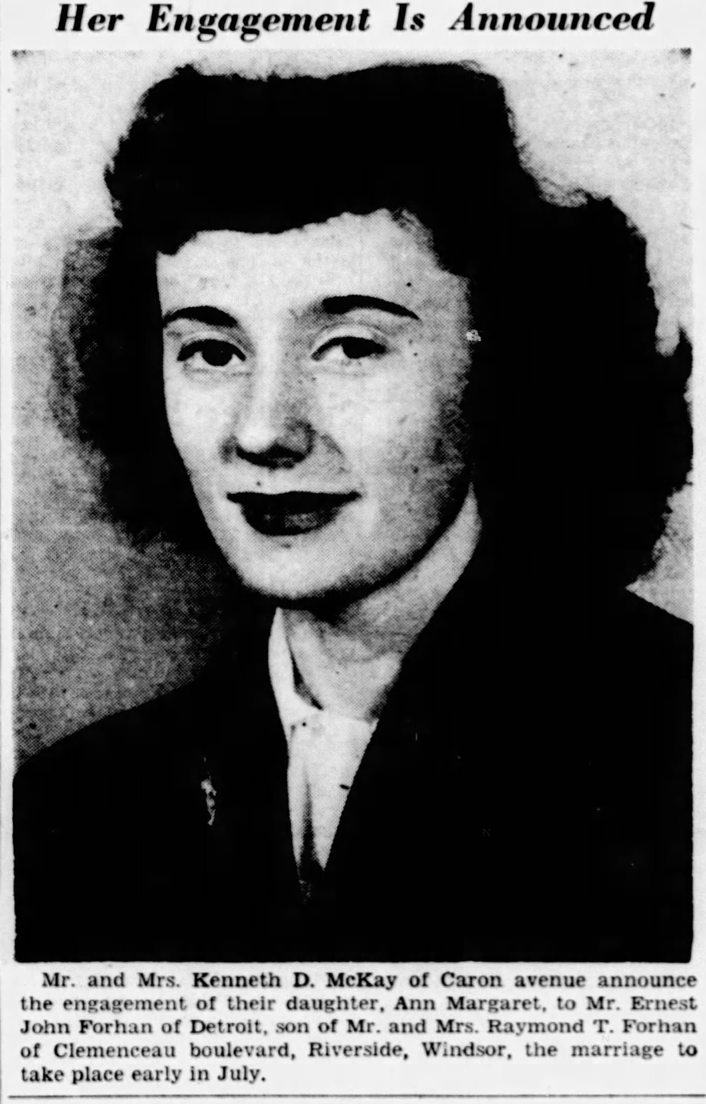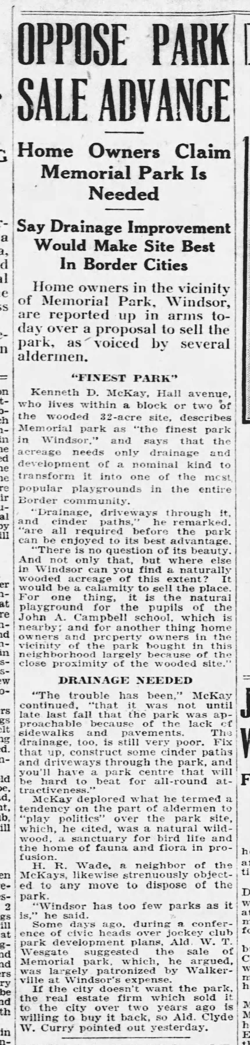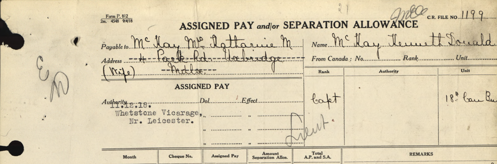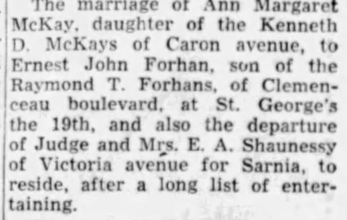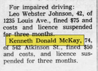 Family Search: When Captain Kenneth Donald McKay was born on 18 September 1894, in Windsor, Essex, Ontario, Canada, his father, John Alexander McKay, was 27 and his mother, Margaret R Brotchie, was 26. He married Katherine Margaret Strudwick in 1918. They were the parents of at least 1 son and 1 daughter. He lived in Ontario, Canada in 1897 and Essex, Ontario, Canada in 1911. He registered for military service in 1914. He died on 10 May 1972, in Windsor, Essex, Ontario, Canada, at the age of 77, and was buried in Windsor Grove Cemetery, Windsor, Essex, Ontario, Canada.