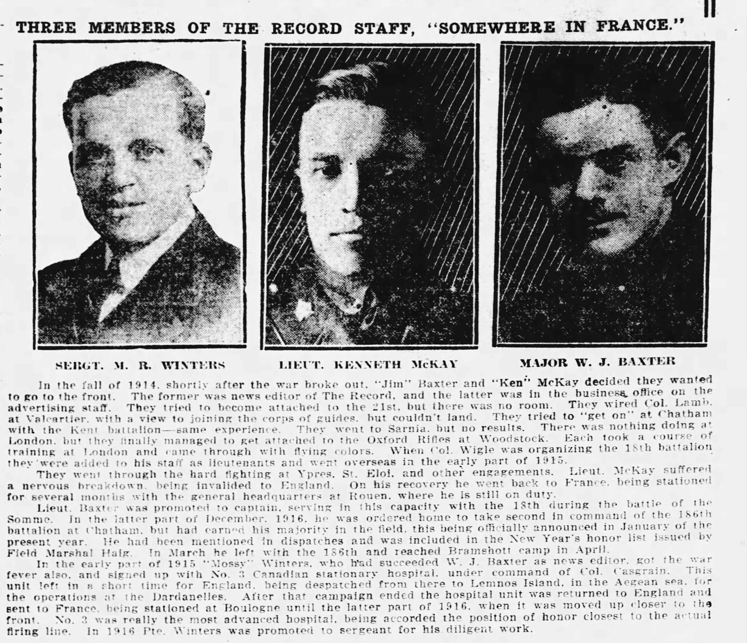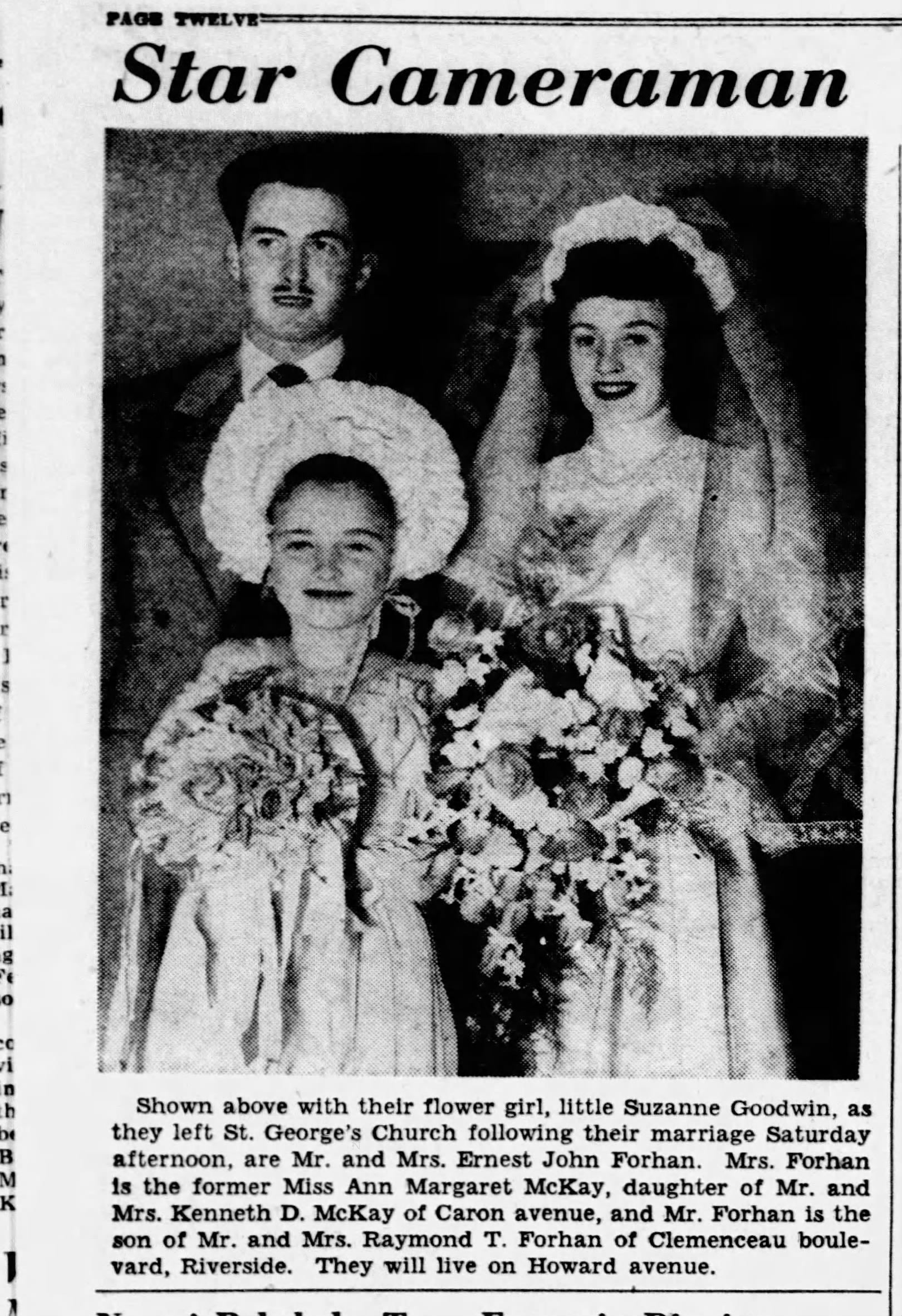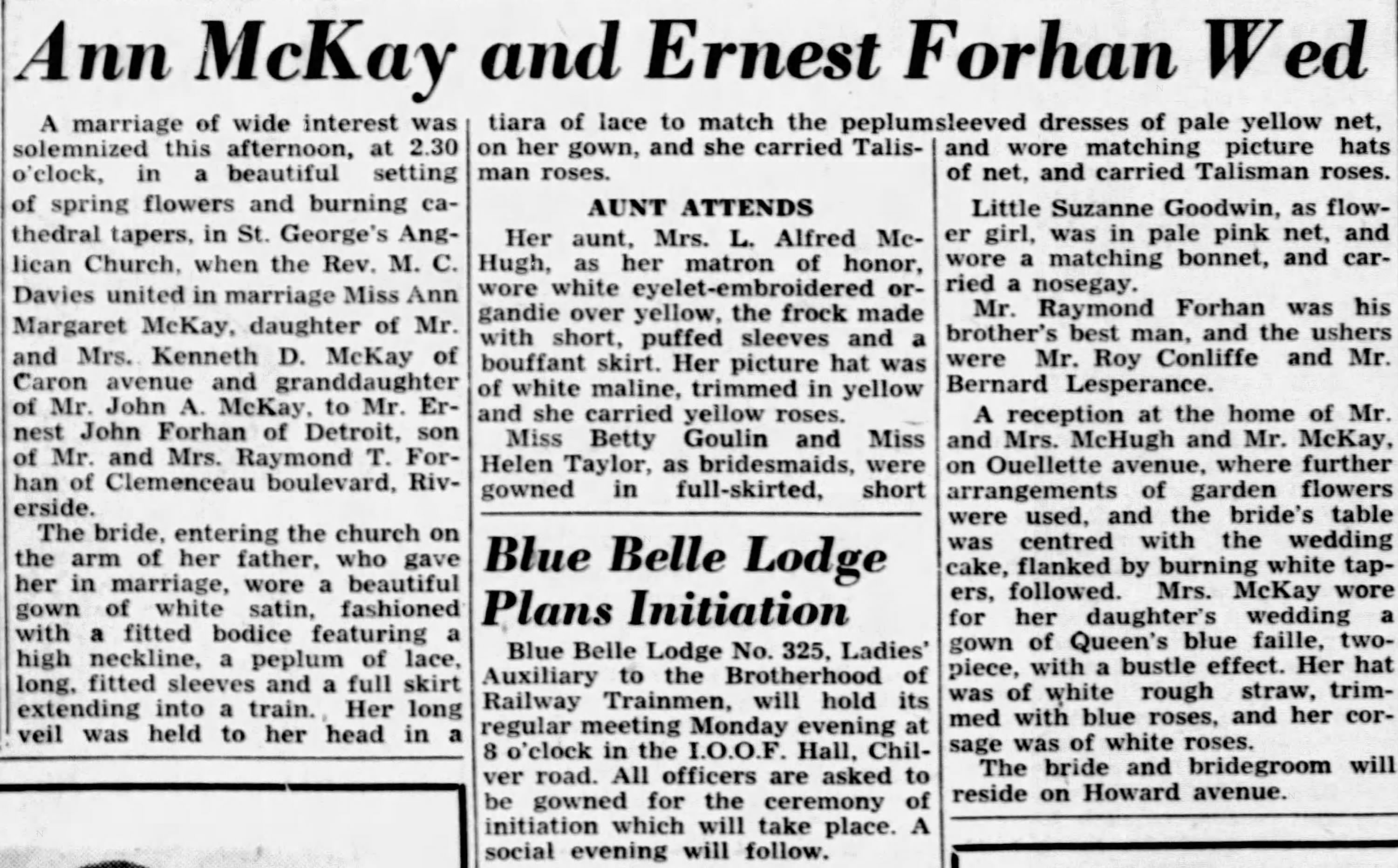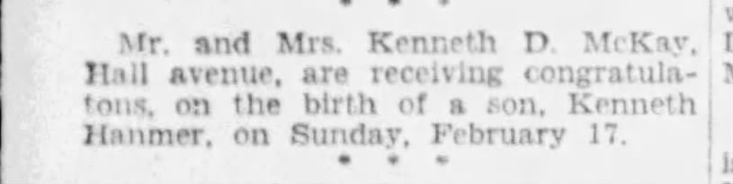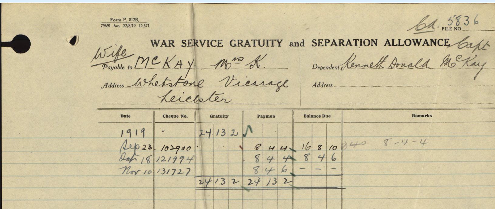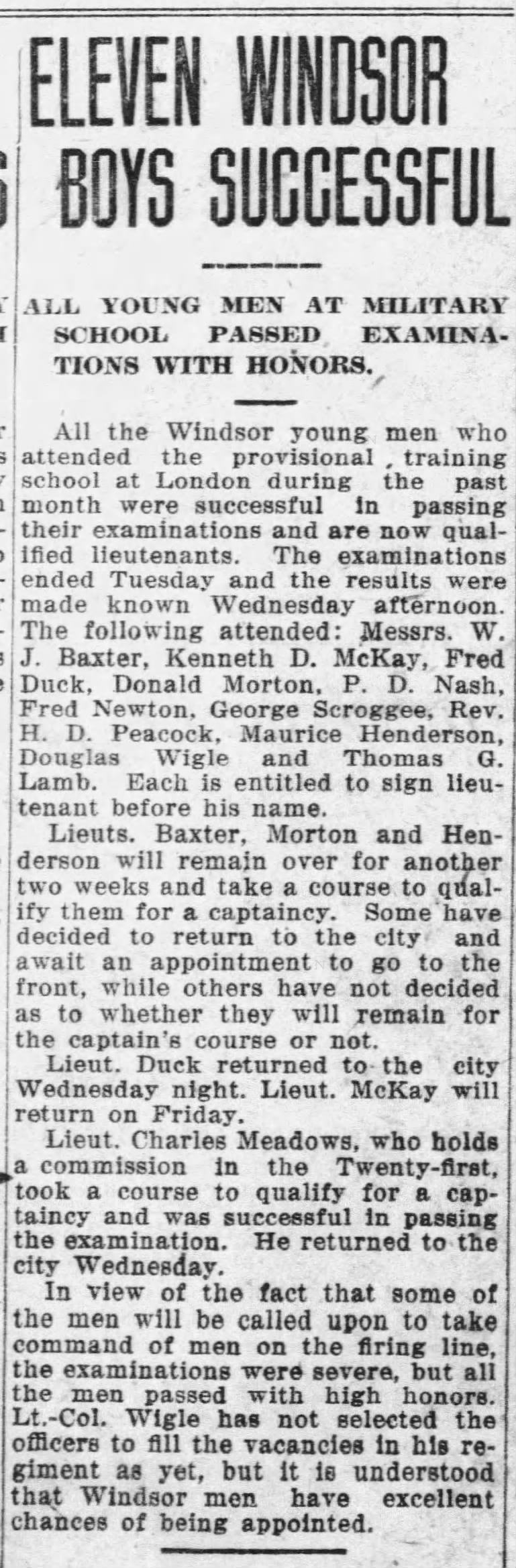 Family Search: When Captain Kenneth Donald McKay was born on 18 September 1894, in Windsor, Essex, Ontario, Canada, his father, John Alexander McKay, was 27 and his mother, Margaret R Brotchie, was 26. He married Katherine Margaret Strudwick in 1918. They were the parents of at least 1 son and 1 daughter. He lived in Ontario, Canada in 1897 and Essex, Ontario, Canada in 1911. He registered for military service in 1914. He died on 10 May 1972, in Windsor, Essex, Ontario, Canada, at the age of 77, and was buried in Windsor Grove Cemetery, Windsor, Essex, Ontario, Canada.