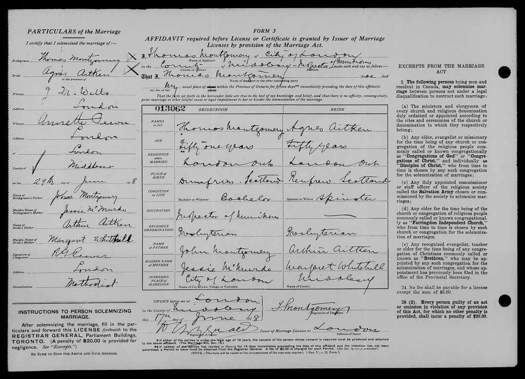 Family Search: Private Thomas Montgomery was born on 25 June 1859, in Dumfries, Dumfries and Galloway, Scotland, United Kingdom as the son of John Montgomery and Jessie McMurdo. He married Maggie Montgomery about 1916, in England, United Kingdom. He immigrated to Canada in 1914 and lived in London, Ontario, Canada for about 2 years. He registered for military service in 1915. In 1915, at the age of 56, his occupation is listed as farmer. He died on 27 December 1946, in Palmerston, Perth, Ontario, Canada, at the age of 87, and was buried in Palmerston, Minto, Wellington, Ontario, Canada.