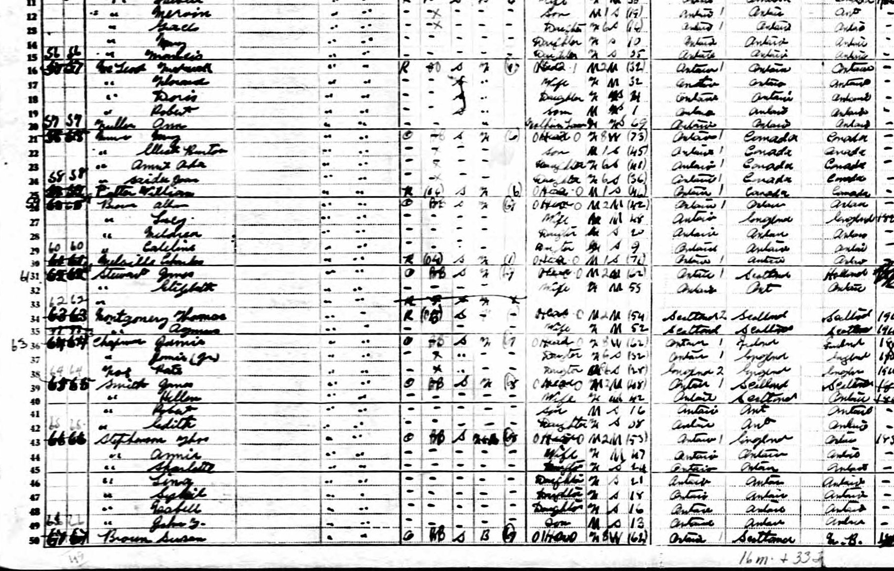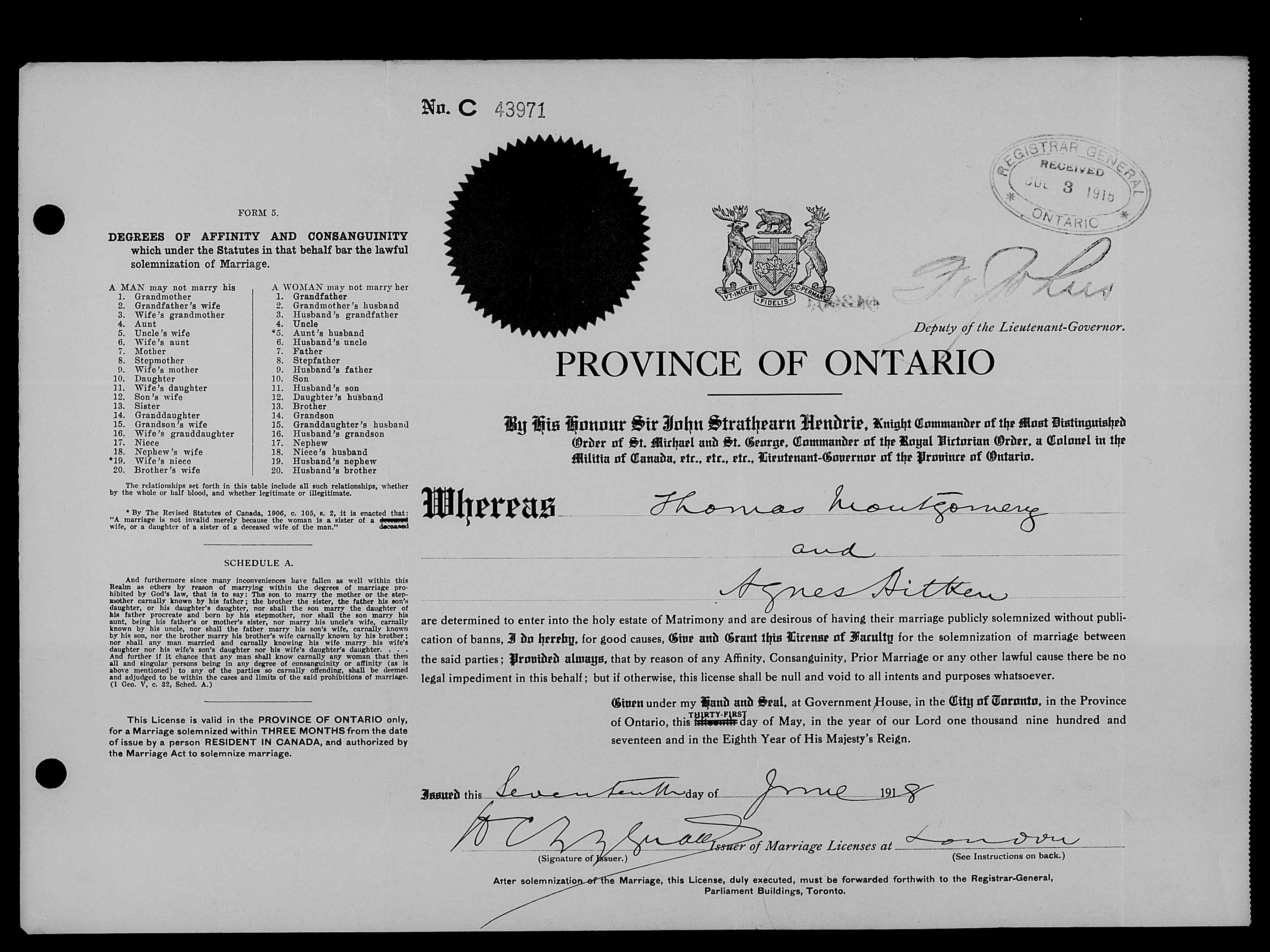 Family Search: Private Thomas Montgomery was born on 25 June 1859, in Dumfries, Dumfries and Galloway, Scotland, United Kingdom as the son of John Montgomery and Jessie McMurdo. He married Maggie Montgomery about 1916, in England, United Kingdom. He immigrated to Canada in 1914 and lived in London, Ontario, Canada for about 2 years. He registered for military service in 1915. In 1915, at the age of 56, his occupation is listed as farmer. He died on 27 December 1946, in Palmerston, Perth, Ontario, Canada, at the age of 87, and was buried in Palmerston, Minto, Wellington, Ontario, Canada.