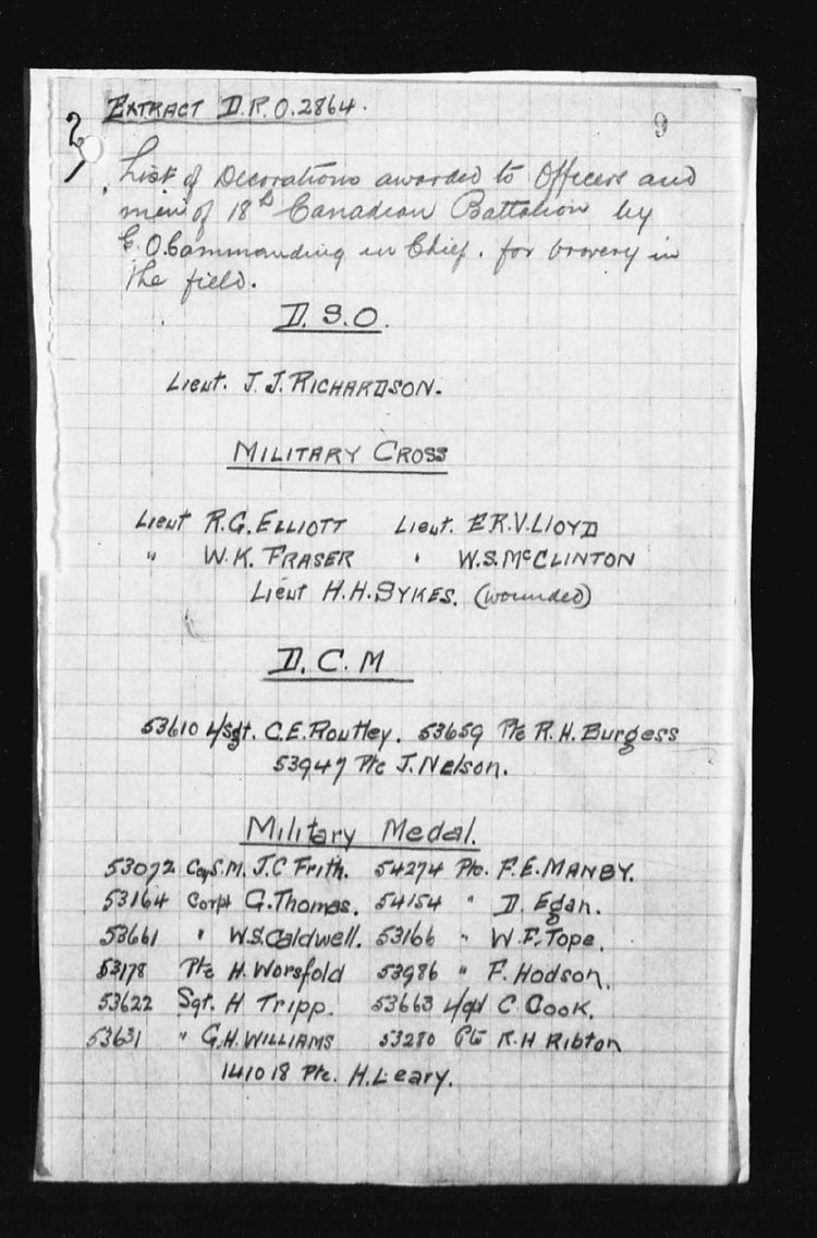 “My grandfather James Quaey Nelson #53947 won a Distinguished Conduct Medal, which my father has, with the 18th battalion at Flers-Courcelette. He was from Glasgow and moved to the Galt Ont. area in 1912, attesting there on Oct 25 1914 age 25. He was in France from Sept 15 1915 until April 26 1918. Survived the war and went back to Preston Ont., got married and moved to Woodstock where he was a moulder at a foundry there. He passed away in 1953. I have his records from LAC and the war diary pages for his DCM.”