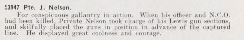 Citation For conspicuous gallantry in action. When his officer and NCO had been killed, Private Nelson took charge of his Lewis gun sections and skilfully placed the guns in position in advance of the captured line. He displayed great coolness and courage throughout the operations.