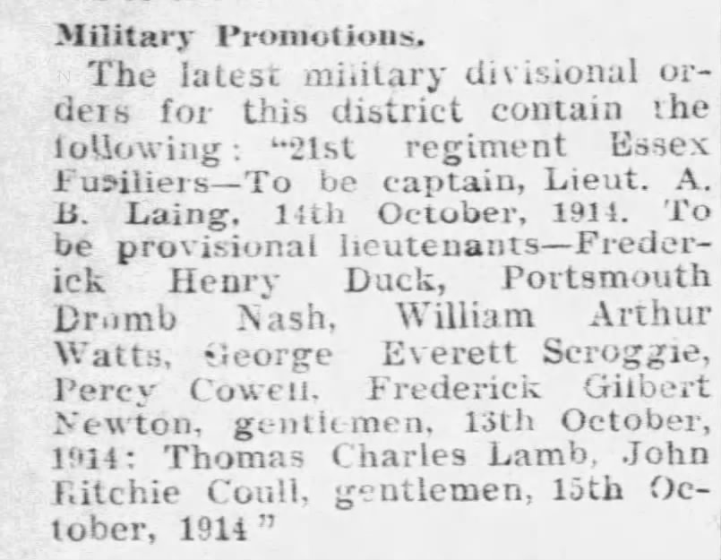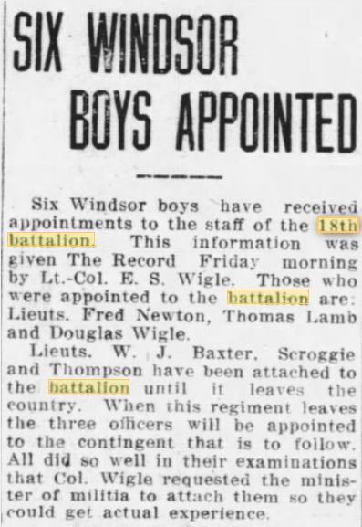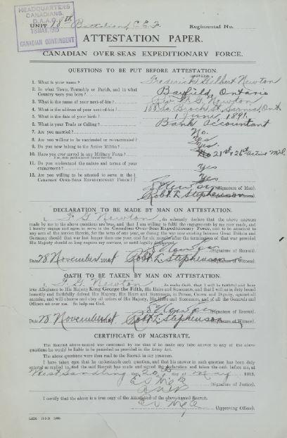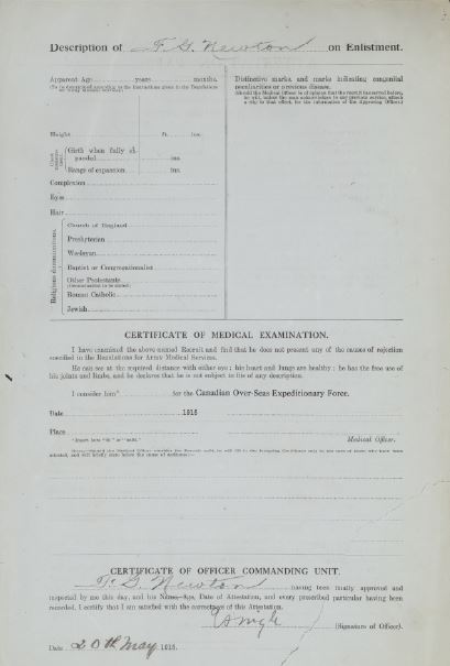 Frederick Newton listed in LAC as a Captain and later as a Lieutenant in 18th Battalion War Diaries. Confirmation of soldier in 18th Battalion Nominal Roll (1915).