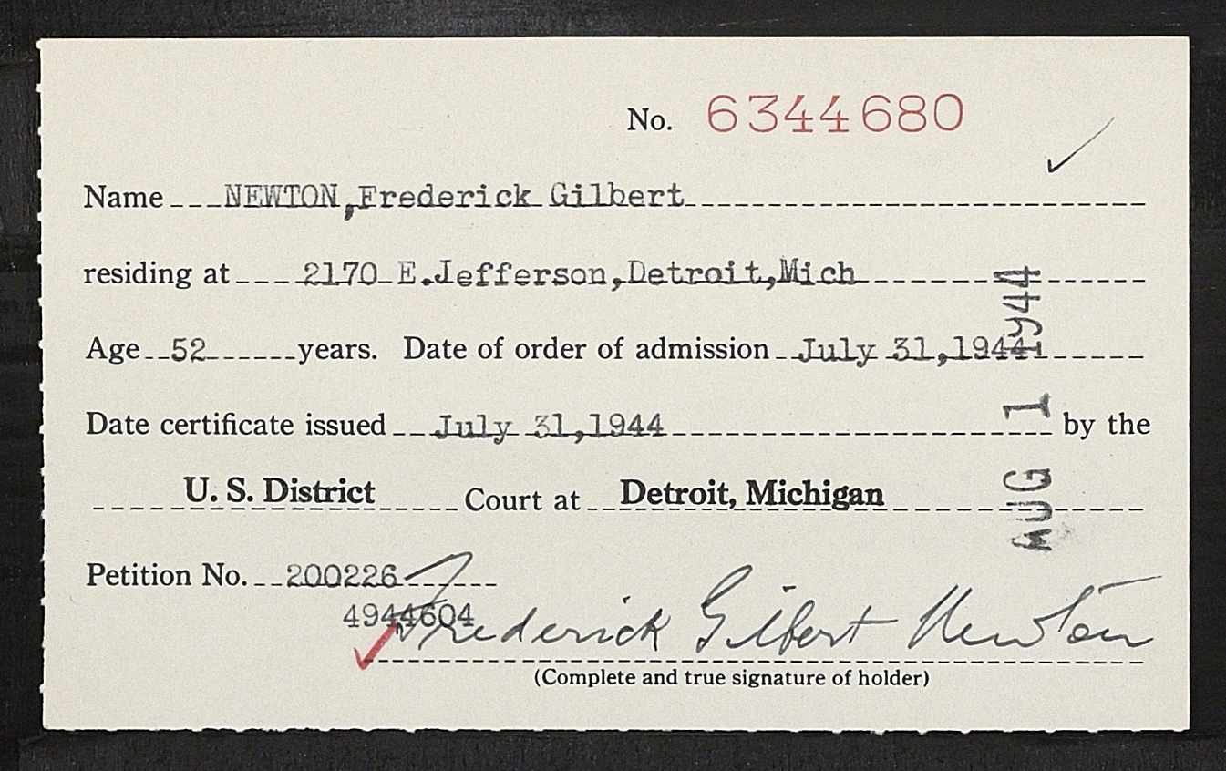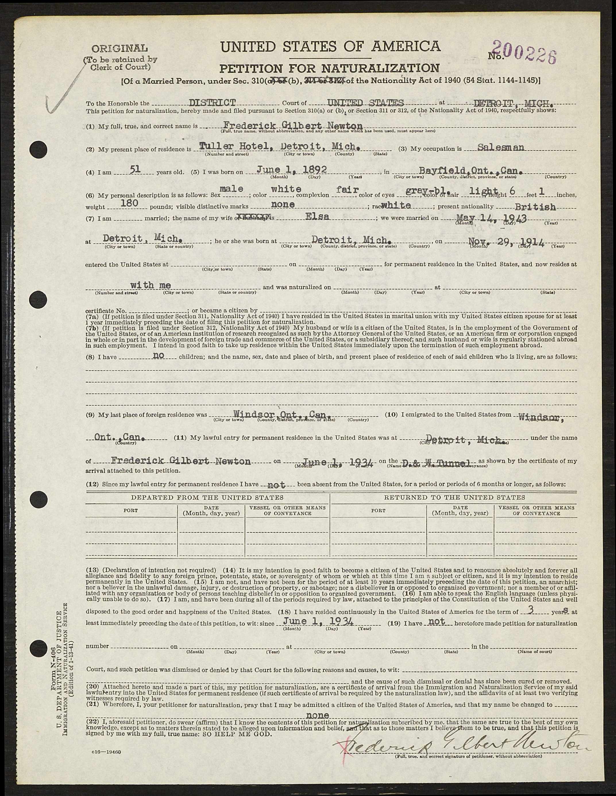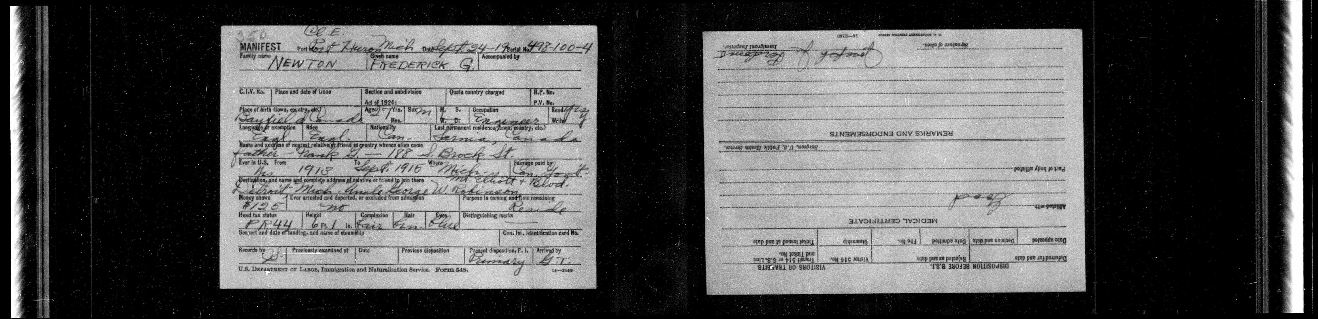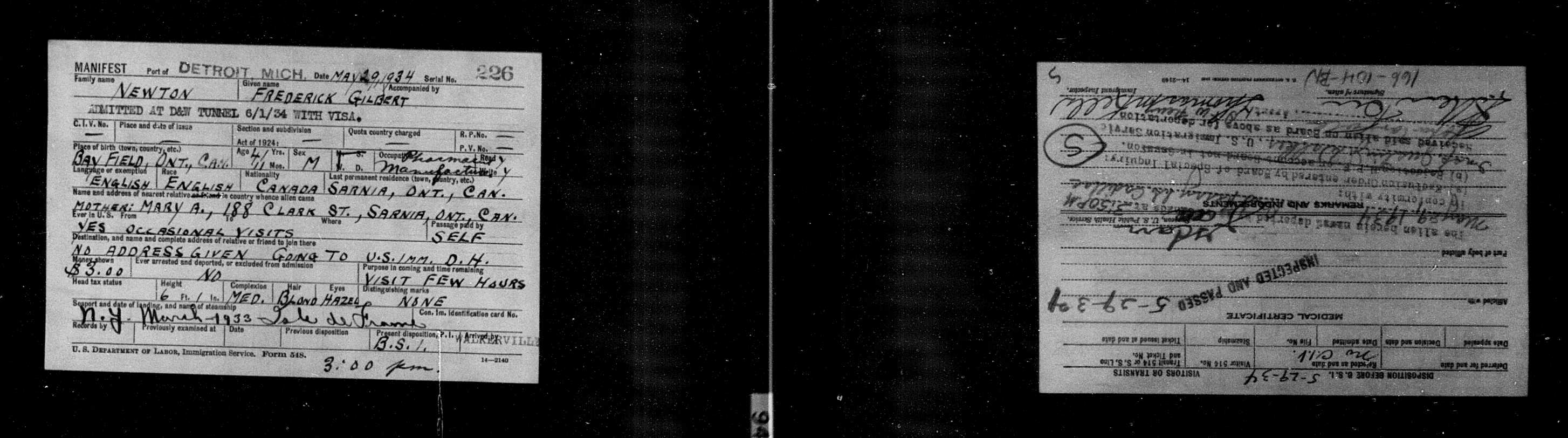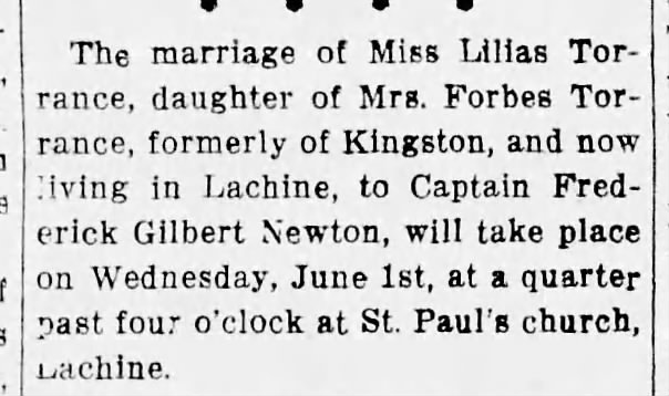 Family Search: When Captain Frederick Gilbert Newton was born on 1 June 1892, in Bayfield, Bluewater, Huron, Ontario, Canada, his father, Frank Gibson Newton, was 36 and his mother, Mary Agnes Robinson, was 18. He married Lilias Torrance on 1 June 1921, in Lachine, Jacques-Cartier, Quebec, Canada. They were the parents of at least 1 son. He immigrated to Detroit, Wayne, Michigan, United States in 1934 and lived in Lambton, Ontario, Canada in 1901 and Detroit, Wayne, Michigan, United States in 1950. He died in 1976, at the age of 84, and was buried in Bayfield, Huron, Ontario, Canada.