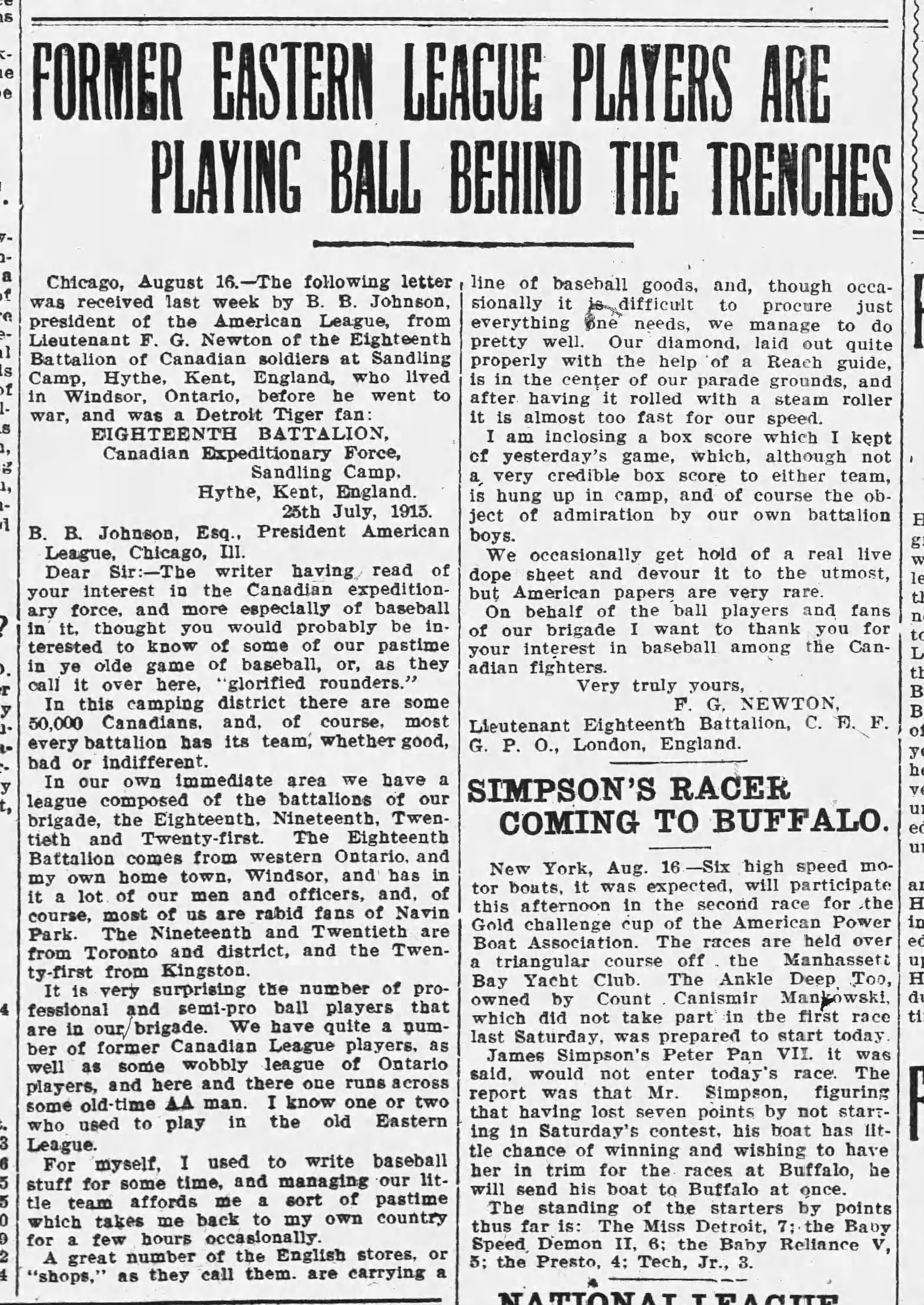 Chicago, August 16.–The following letter was received last week by B. B. Johnson, president of the American League, from Lieutenant F. G. Newton of the Eighteenth Battalion of Canadian soldiers at Sandling Camp, Hythe, Kent, England, who served in Windsor, Ontario, before he went to war, and was a Detroit Tiger fan.