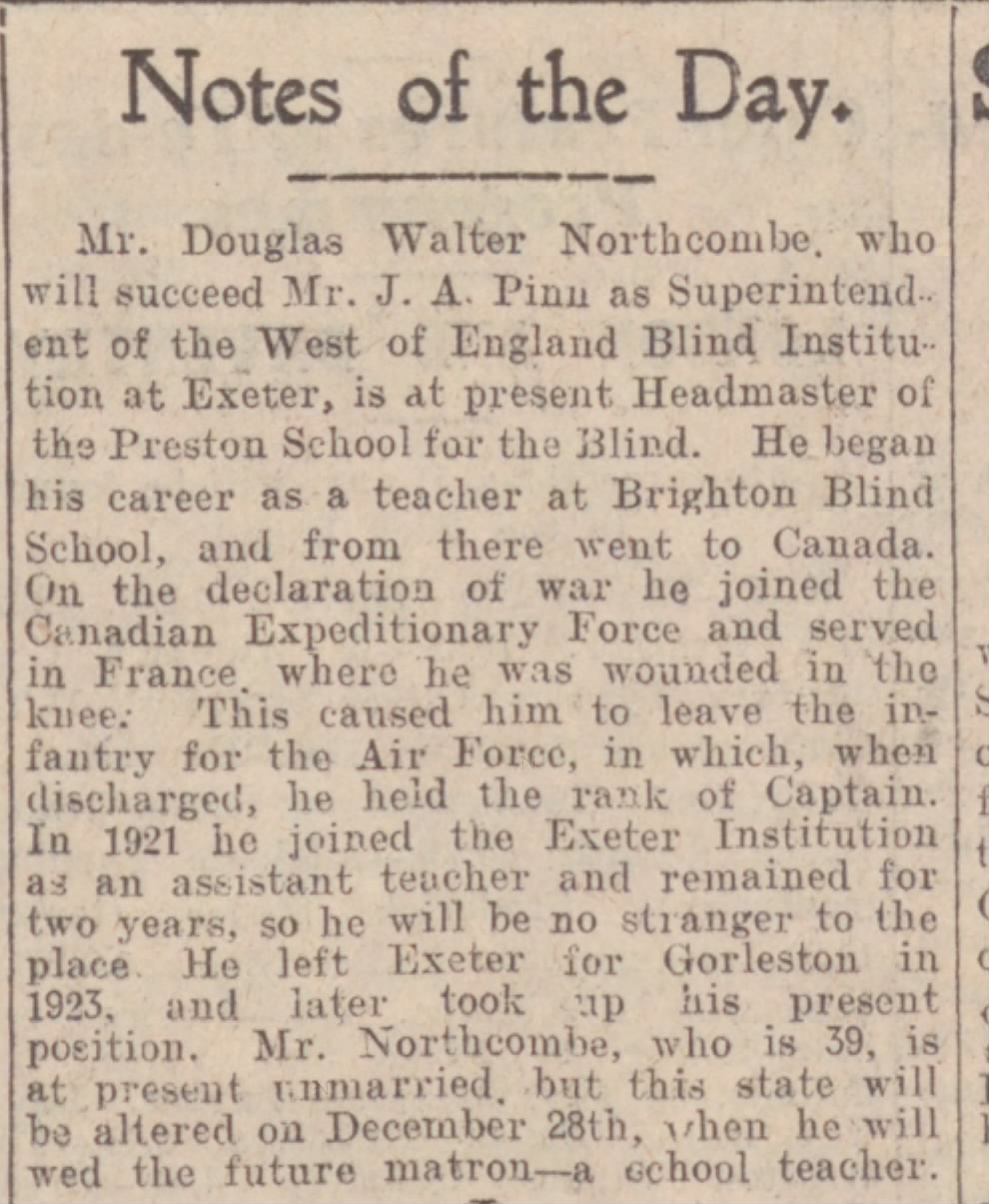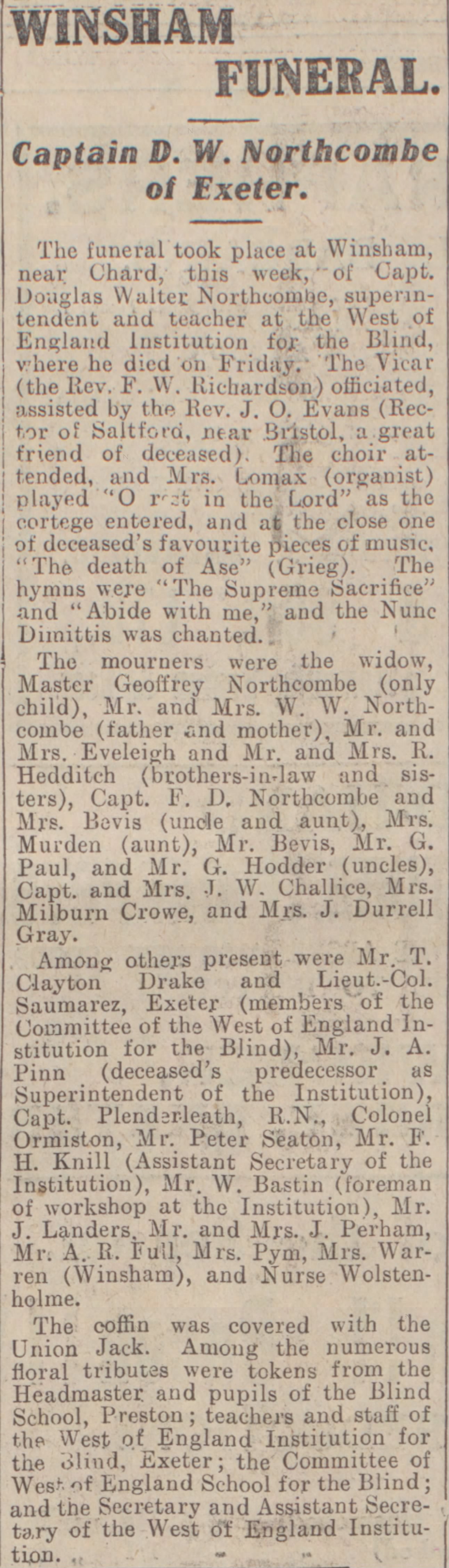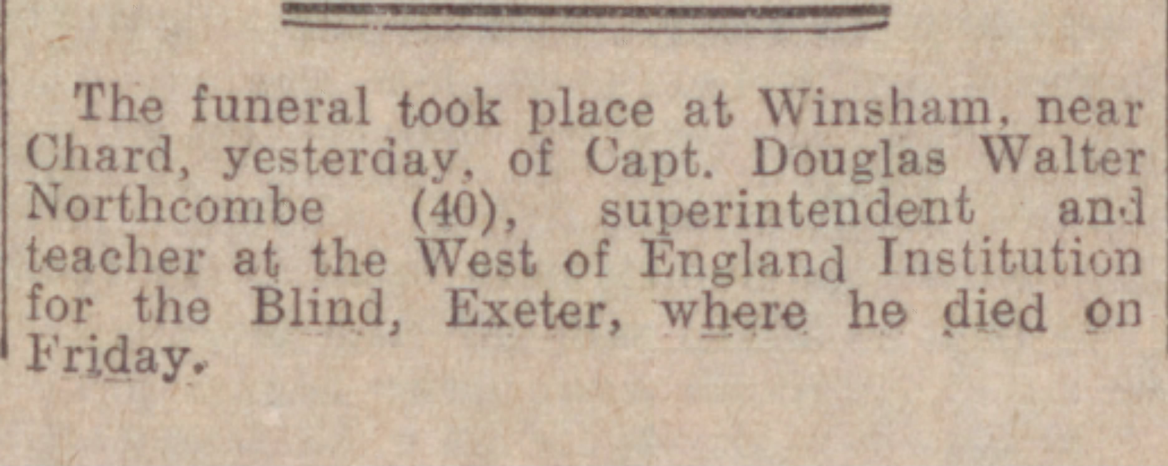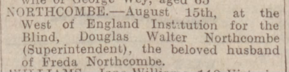 Family Search: When Lieutenant Douglas Walter Northcombe was born on 11 June 1890, in Chard, Somerset, England, his father, Walter Northcombe, was 30 and his mother, Mary Hodder, was 27. He married Edith Rosiland Darlington in 1915, in Hampstead, Camden, London, England, United Kingdom. He lived in Brighton, Sussex, England, United Kingdom, in 1911 and Winsham, Devon, England, United Kingdom, in 1930. In 1930, at the age of 40, his occupation is listed as superintendent, the West of England school for young people with little or no sight in Exeter, Devon, England, United Kingdom. He died on 15 August 1930, in Exeter, Devon, England, United Kingdom, at the age of 40, and was buried in Winsham, Devon, England, United Kingdom.