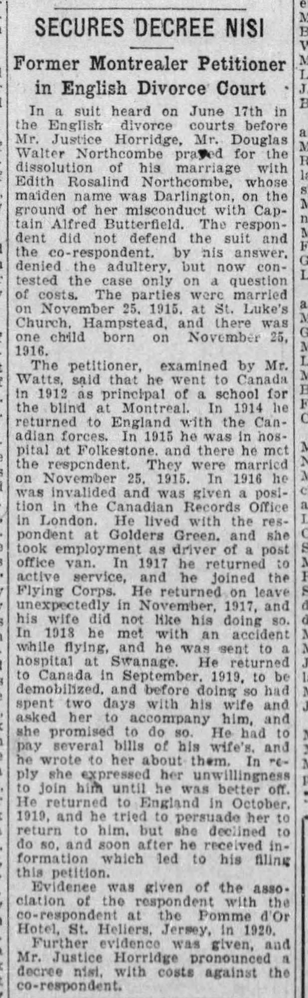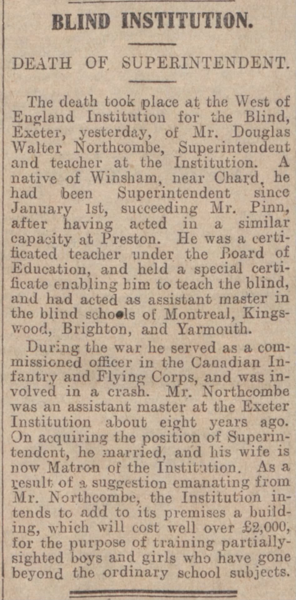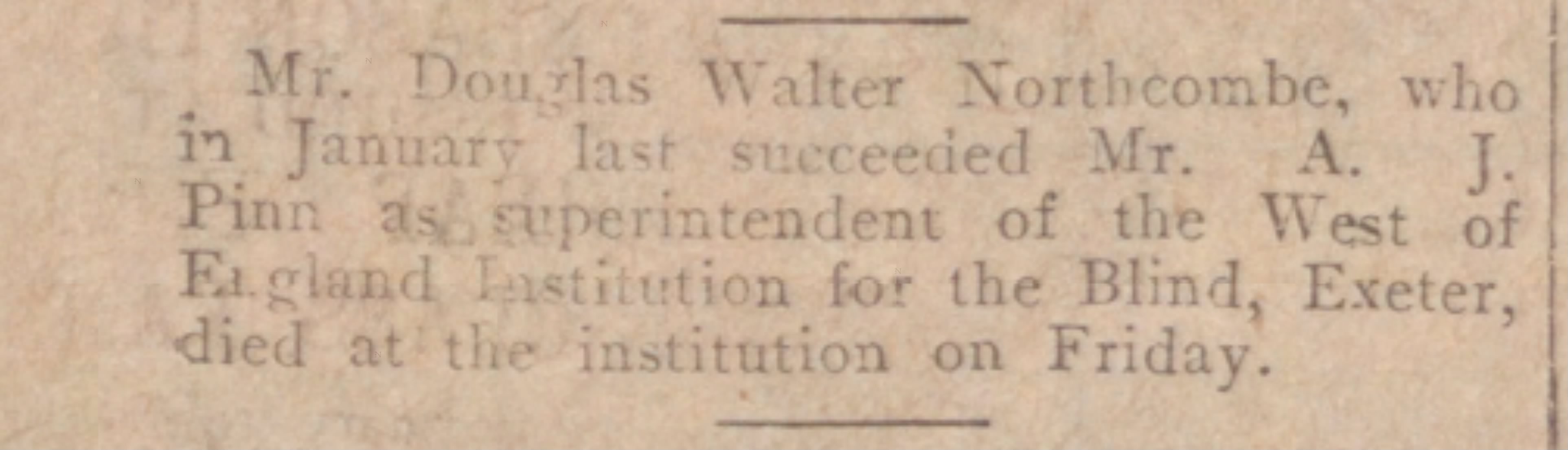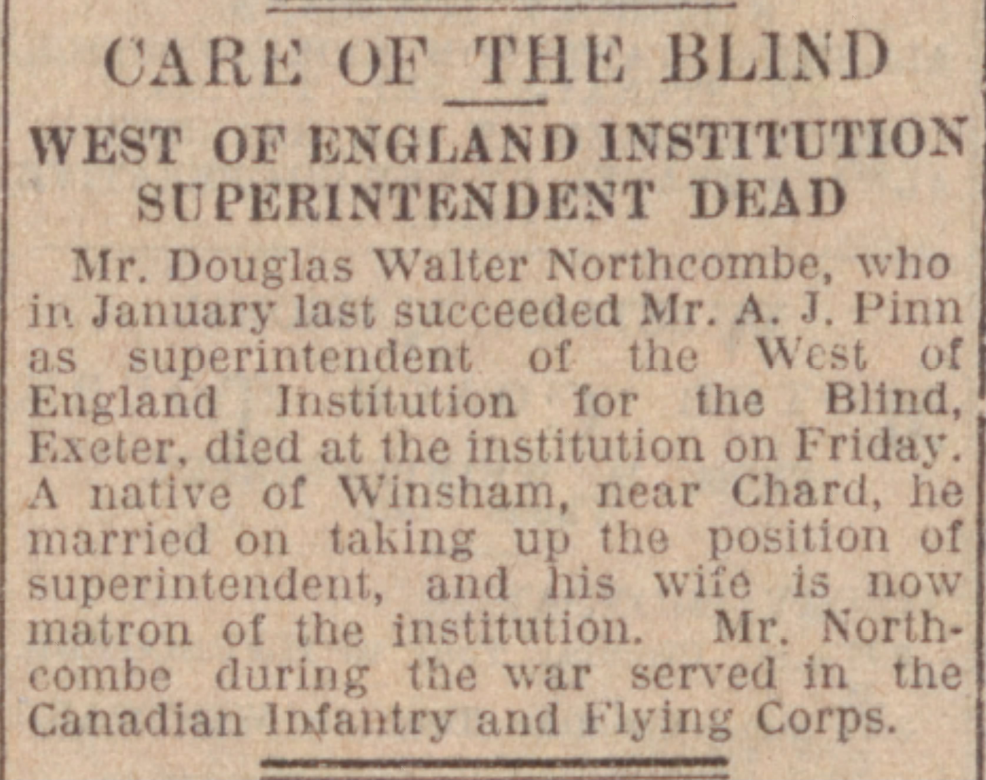 Family Search: When Lieutenant Douglas Walter Northcombe was born on 11 June 1890, in Chard, Somerset, England, his father, Walter Northcombe, was 30 and his mother, Mary Hodder, was 27. He married Edith Rosiland Darlington in 1915, in Hampstead, Camden, London, England, United Kingdom. He lived in Brighton, Sussex, England, United Kingdom, in 1911 and Winsham, Devon, England, United Kingdom, in 1930. In 1930, at the age of 40, his occupation is listed as superintendent, the West of England school for young people with little or no sight in Exeter, Devon, England, United Kingdom. He died on 15 August 1930, in Exeter, Devon, England, United Kingdom, at the age of 40, and was buried in Winsham, Devon, England, United Kingdom.