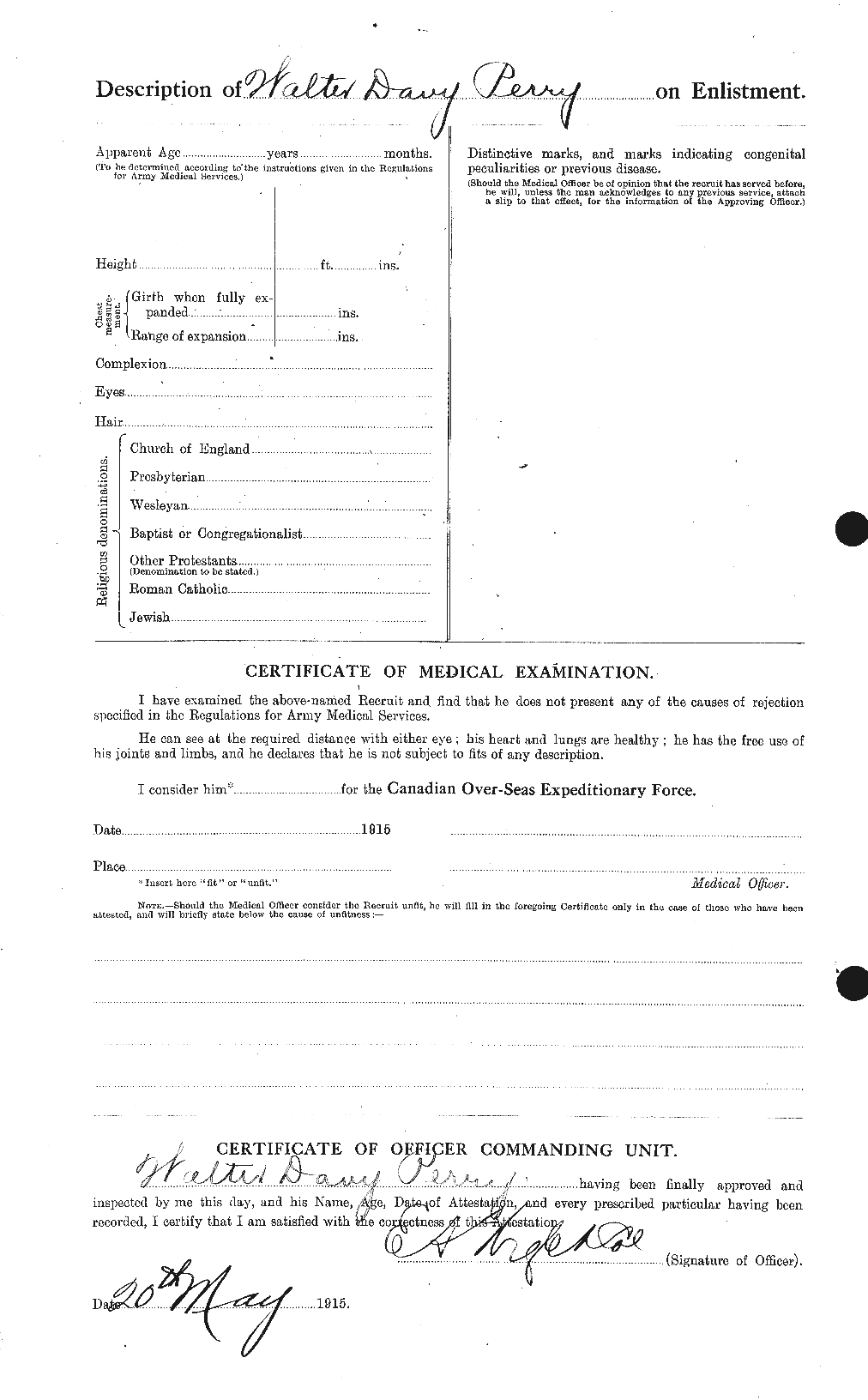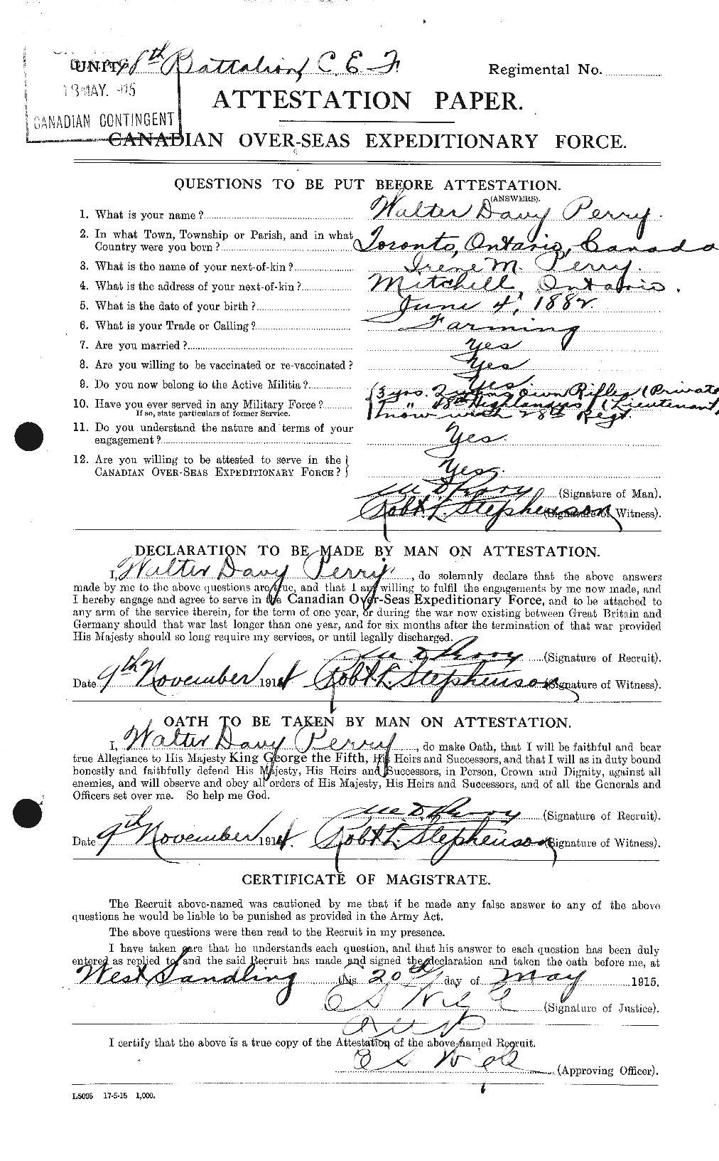 Tony has his first name as “William”, but his own signature is on the marriage record as “Walter” His birth was not registered contemporaneously, but was registered by his sister, Edith Mary Clarkson, 18 May 1928 at Toronto. She gave the birth date as 4 June 1883, and stated that she was 4 years older than he. At the time of his enlistment fo the Overseas Expeditionary Force 9 Nov 1914, he gave his birth as 4 June 1882, a difference of one year. He was married and farming at that time. Crossed to Detroit 26 May 1928 with wife and children John and Alice. He was age 44y 11m. Son of Robert Davey Perry from Oswego, NY and Barbara Smith of Aberdeen, Scotland.Lived in Peterborough.
