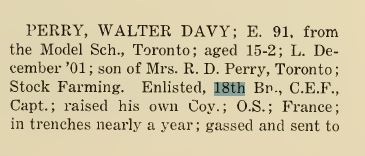 PERRY, WALTER DAVY; E. 91 from the Model Sch., Toronto; aged 15-2; L. December ’01; son of Mrs. R.D. Perry, Toronto; Stock Farming. Enlisted 18th Bn,. C.E.F., Capt.; raised his own Coy.; O.S.; France; in trenches nearly a year; gassed and sent to London, England. ret’d from O.S.; discharged.