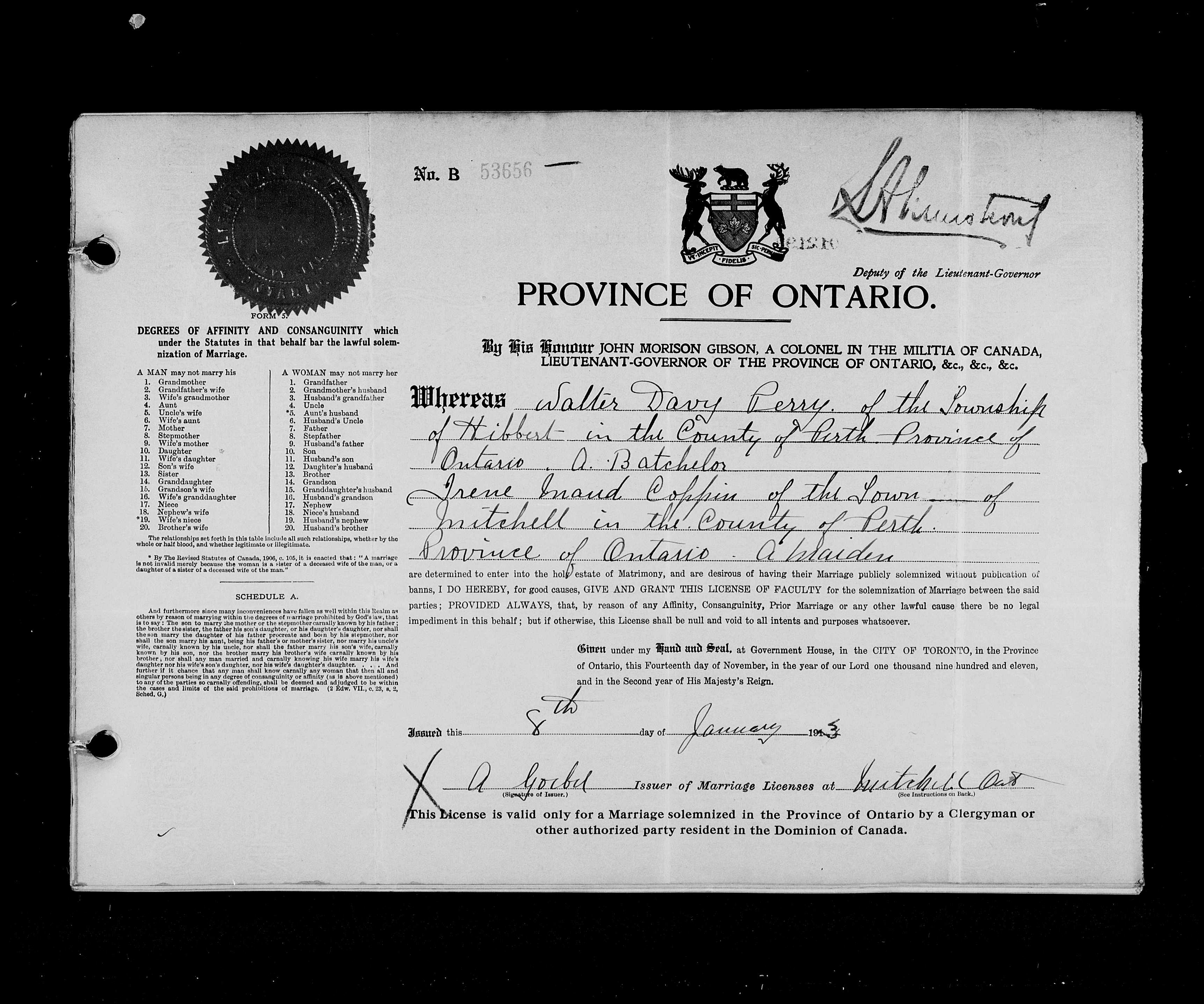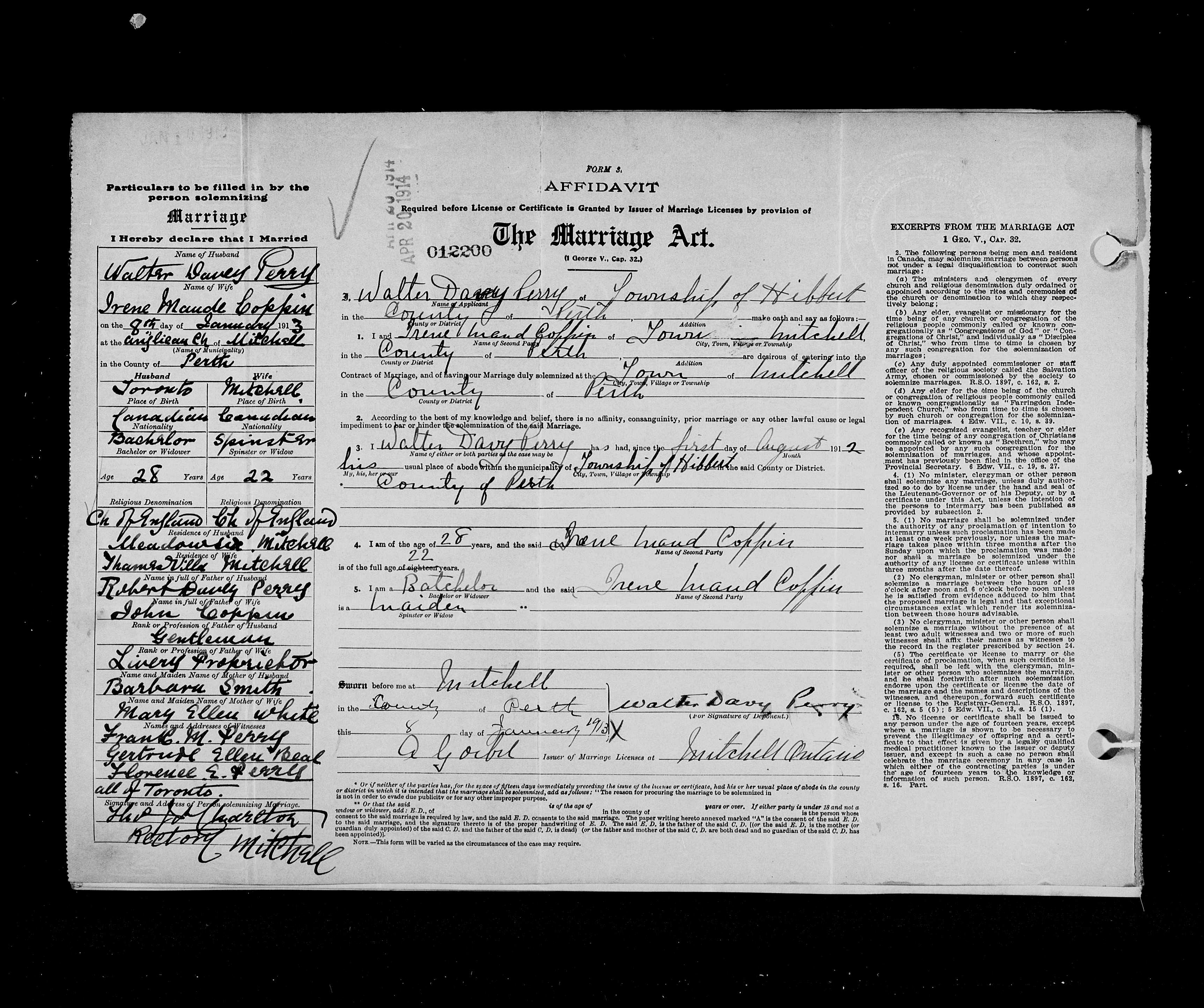 Family Search: When Walter Davy Smith Perry was born on 4 June 1882, in Toronto, York, Ontario, Canada, his father, Robert Davy Perry, was 37 and his mother, Barbara Mary Smith, was 31. He married Irene Maud Coppin on 8 January 1913, in Mitchell, West Perth, Perth, Ontario, Canada. They were the parents of at least 2 sons and 1 daughter. He lived in York, Ontario, Canada in 1901 and Simcoe, Ontario, Canada in 1911. He registered for military service in 1914. In 1914, at the age of 32, his occupation is listed as farmer in Mitchell, West Perth, Perth, Ontario, Canada. He died on 30 August 1954, in Gannon Village, Selwyn, Peterborough, Ontario, Canada, at the age of 72, and was buried in Mount Pleasant Cemetery, Toronto, York, Ontario, Canada.