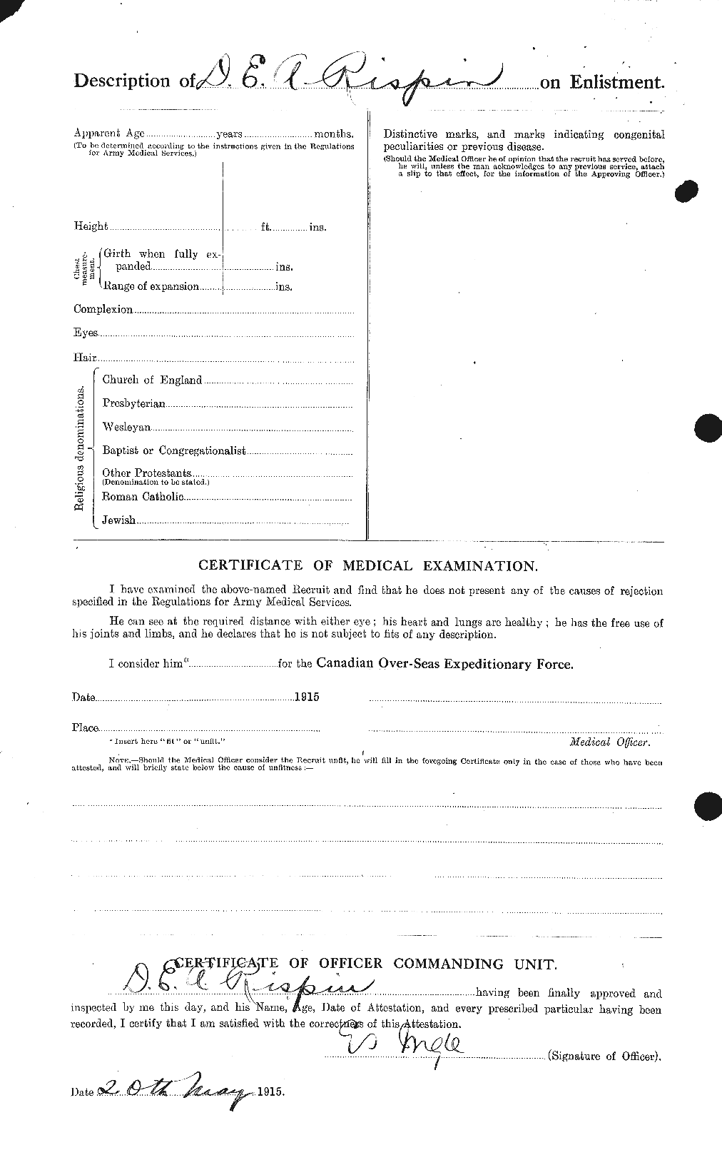Discharged at London May 28th 1919 due to demobilization.