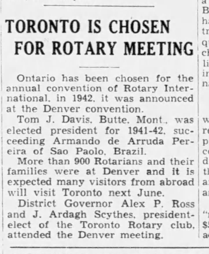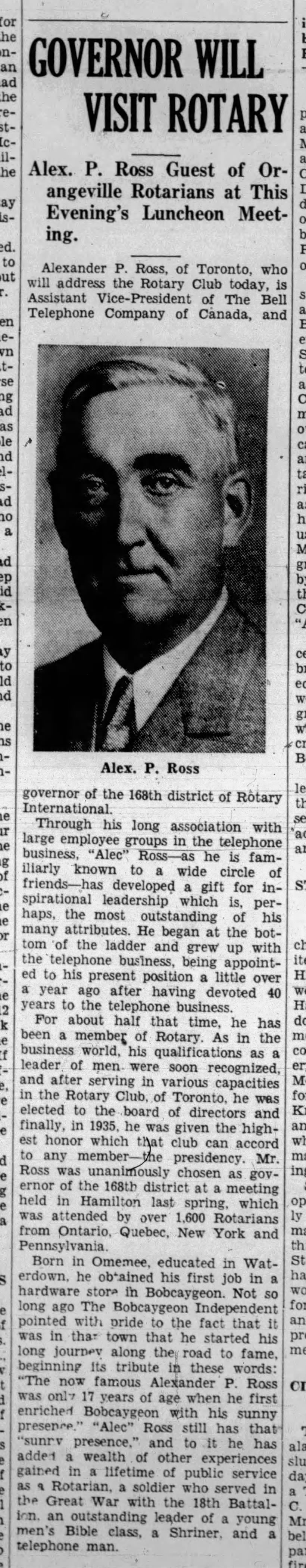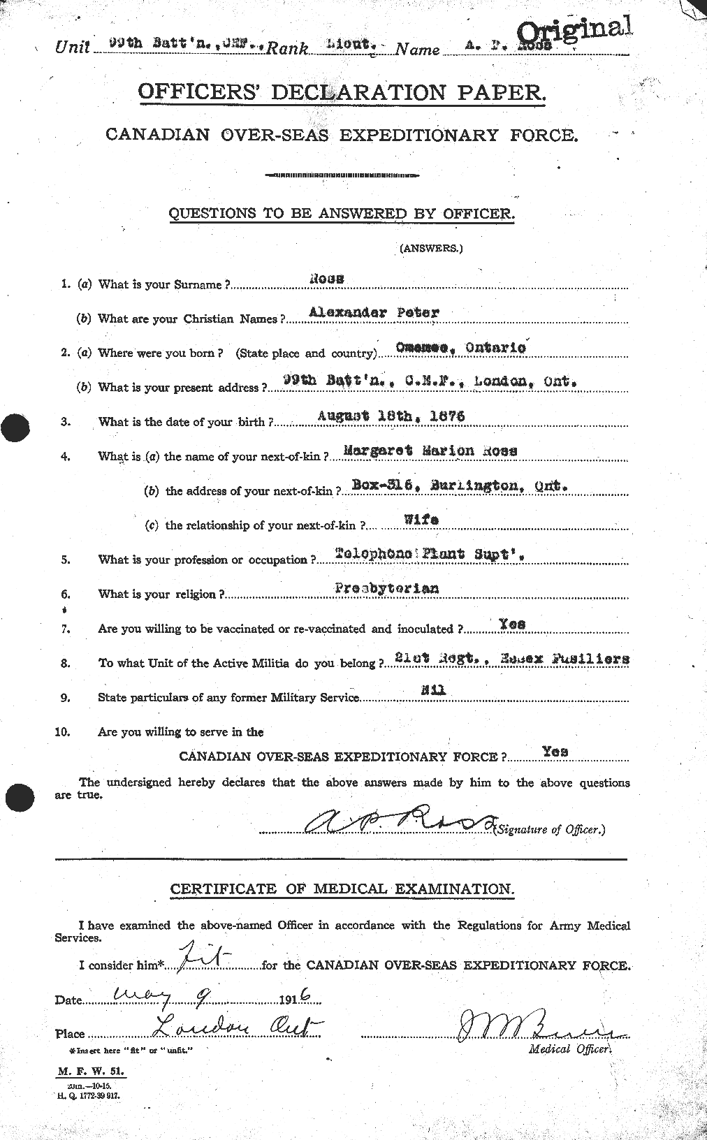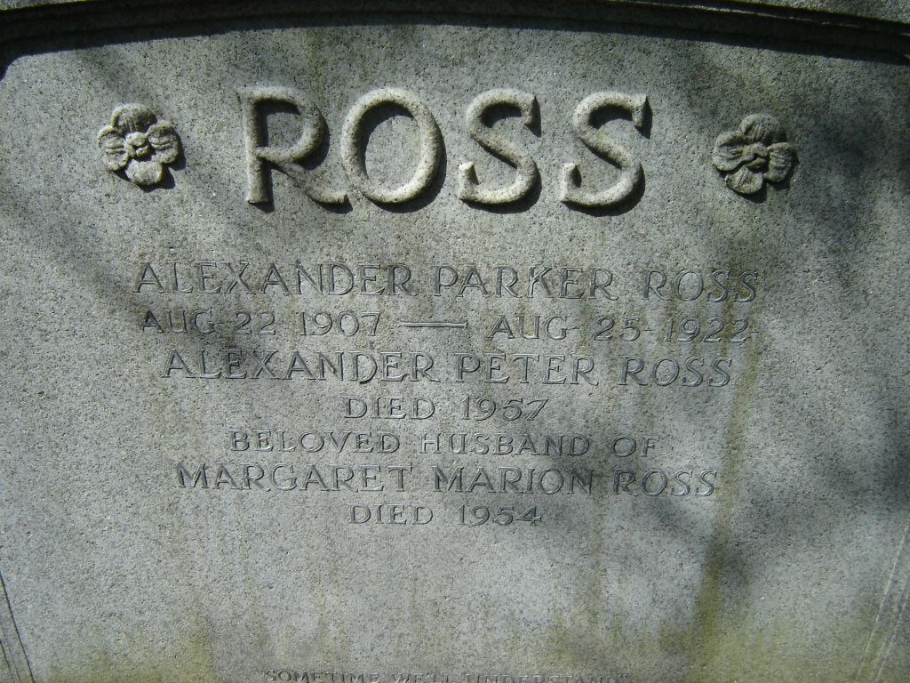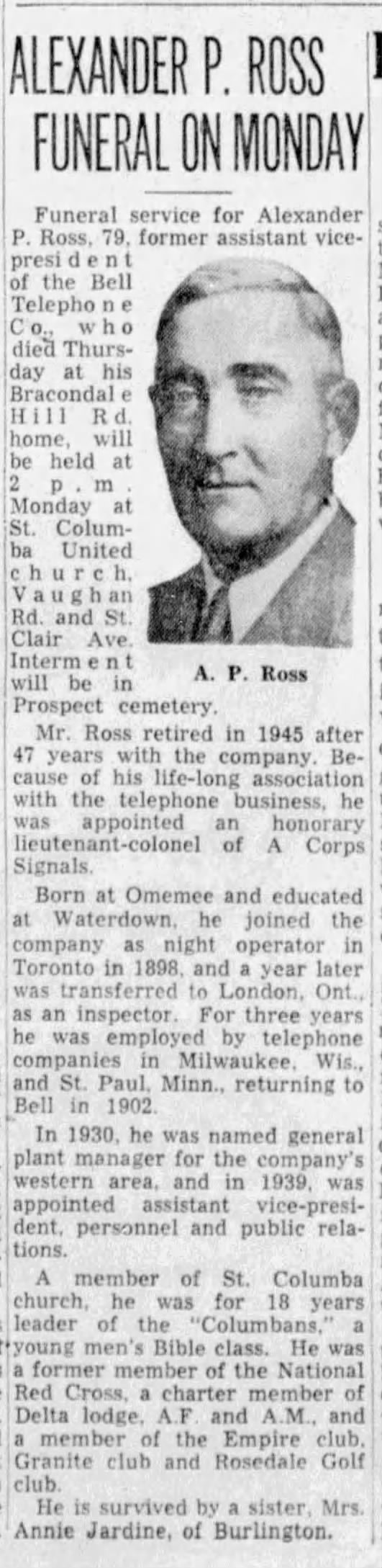 Family Search: Colonel Alexander Peter Ross was born on 18 August 1876, in Omemee, Victoria, Ontario, Canada as the son of John Ross and Eliza Yule. He married Margaret Marion Davis on 20 June 1905, in Toronto, Ontario, Canada. They were the parents of at least 1 son. He lived in Hamilton, Wentworth, Ontario, Canada in 1922 and Toronto, York, Ontario, Canada in 1934. He registered for military service in 1916. In 1940, his occupation is listed as assistant vice president, bell canada in Toronto, York, Ontario, Canada. He died on 17 November 1955, in Toronto, Ontario, Canada, at the age of 79, and was buried in Prospect Cemetery, Toronto, Ontario, Canada.
