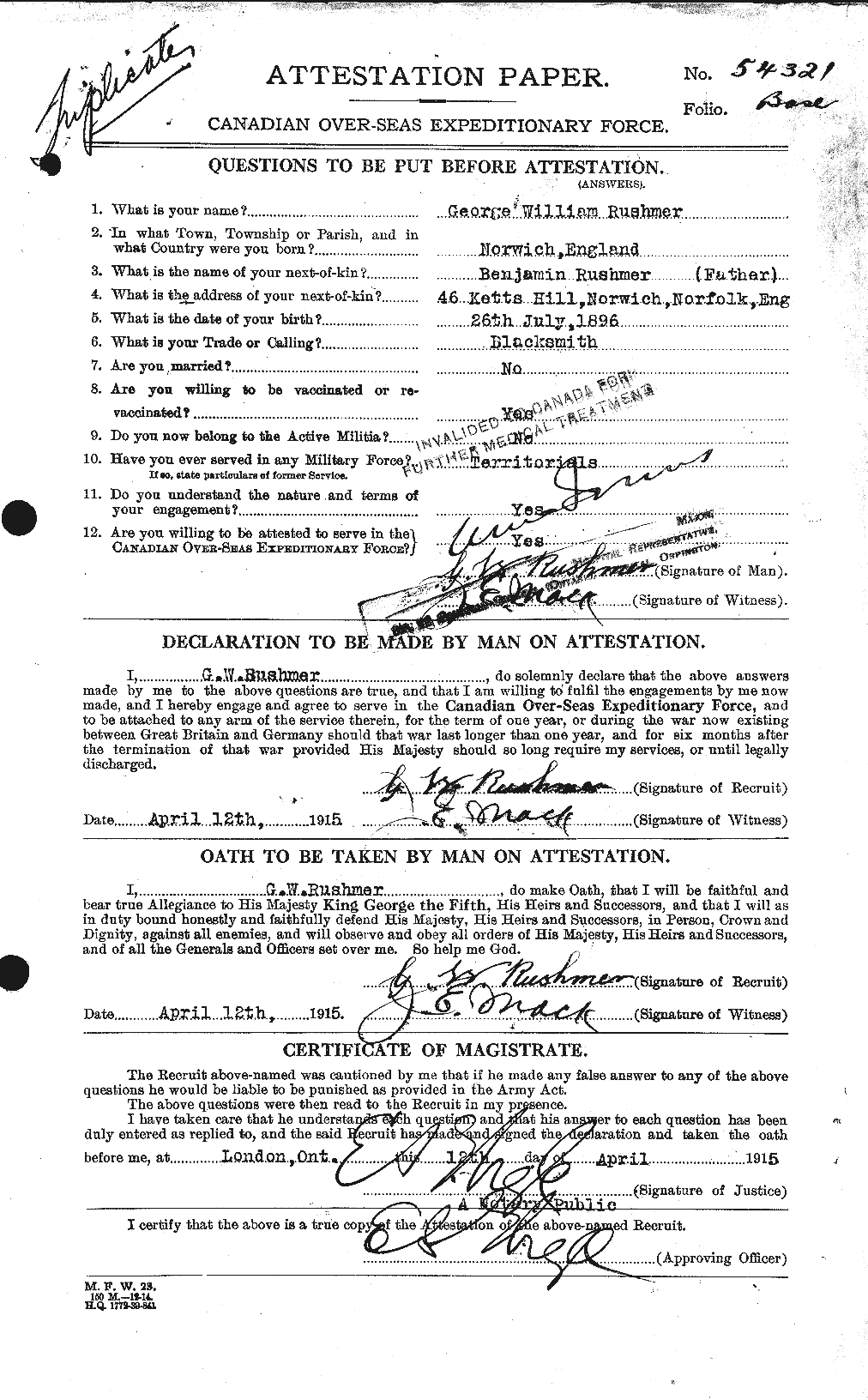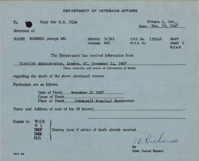 Family Search: When George William Rushmer was born on 26 July 1895, in Norwich, Norfolk, England, United Kingdom, his father, Benjamin John Rushmer, was 27 and his mother, Charlotte Mills, was 25. He married Florence Mabel Harrison on 6 December 1921, in Cheetham Hill, Lancashire, England, United Kingdom. They were the parents of at least 1 son. He immigrated to Canada in 1914 and lived in Manchester, Greater Manchester, England, United Kingdom in 1921 and Manchester, Lancashire, England, United Kingdom in 1939. He registered for military service in 1915. In 1914, at the age of 19, his occupation is listed as blacksmith. He died on 21 November 1967, in Manchester, Lancashire, England, at the age of 72.