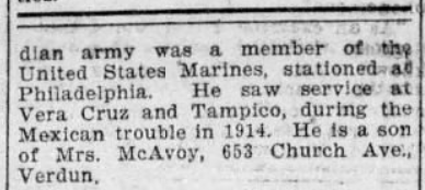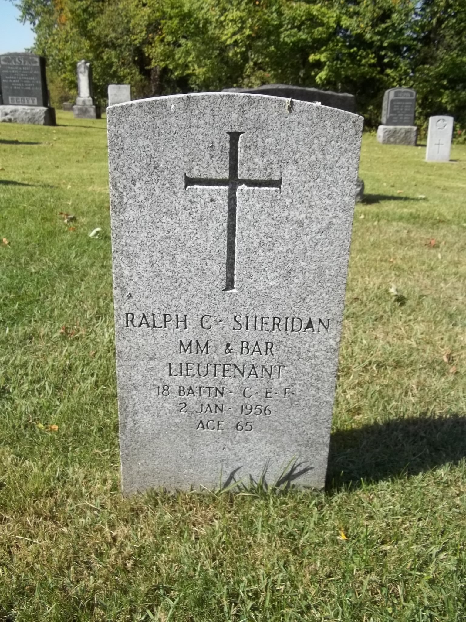 Family Search: Lieutenant Ralph Cecil Sheridan was born on 16 March 1889, in Sutton, Brome, Quebec, Canada as the son of James H. Sheridan and Jennie M. Searles. He married Anne Noon Ward on 21 February 1922, in Niagara, Niagara, New York, United States. They were the parents of at least 2 sons and 2 daughters. He lived in New York City, New York, United States in 1911. He registered for military service in 1911. In 1914, at the age of 25, his occupation is listed as boilermaker. He died on 2 January 1956, in Sutton, Brome, Quebec, Canada, at the age of 66, and was buried in Fairmount Cemetery, Sutton, Brome-Missisquoi, Quebec, Canada.