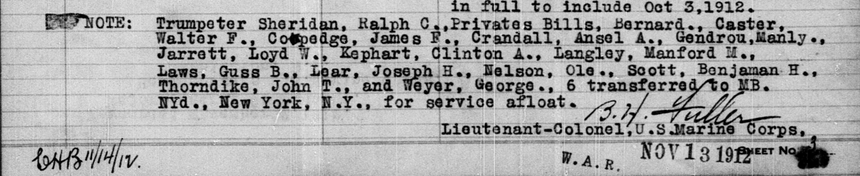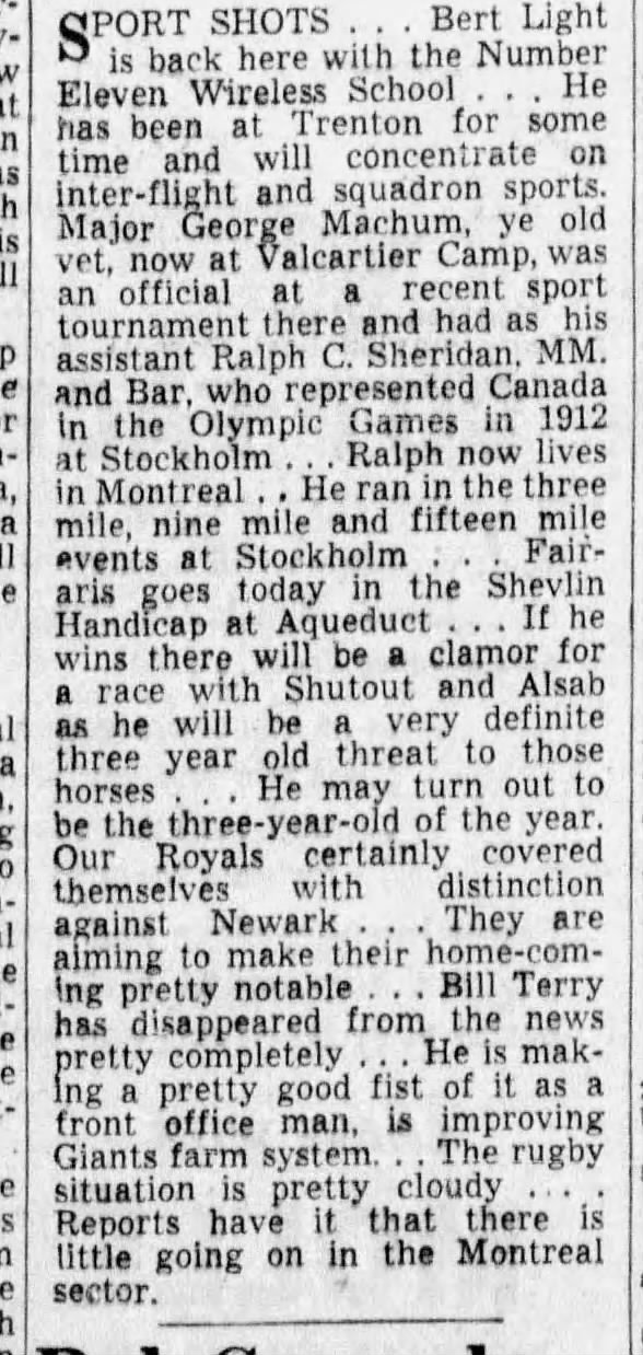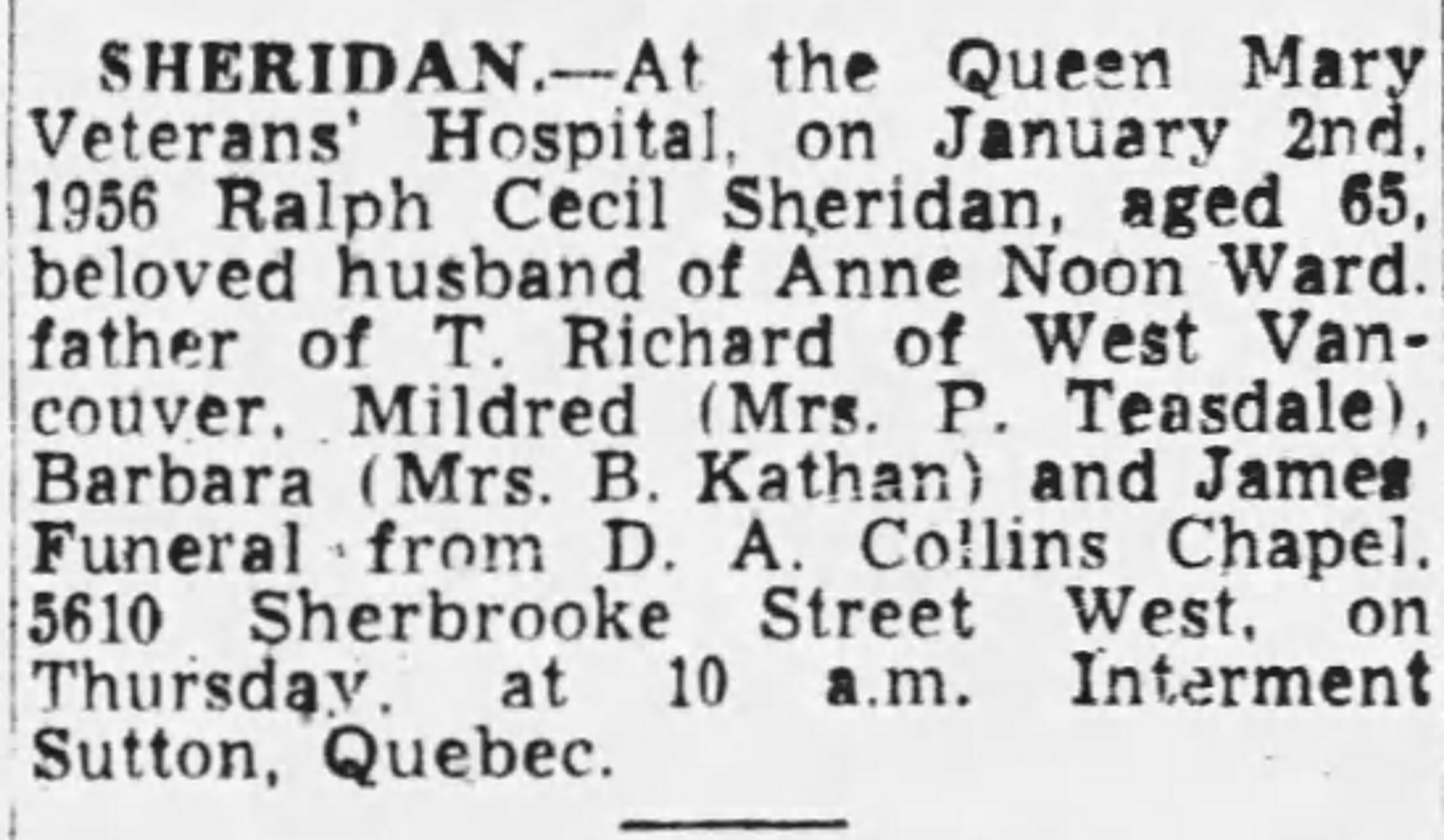 Family Search: Lieutenant Ralph Cecil Sheridan was born on 16 March 1889, in Sutton, Brome, Quebec, Canada as the son of James H. Sheridan and Jennie M. Searles. He married Anne Noon Ward on 21 February 1922, in Niagara, Niagara, New York, United States. They were the parents of at least 2 sons and 2 daughters. He lived in New York City, New York, United States in 1911. He registered for military service in 1911. In 1914, at the age of 25, his occupation is listed as boilermaker. He died on 2 January 1956, in Sutton, Brome, Quebec, Canada, at the age of 66, and was buried in Fairmount Cemetery, Sutton, Brome-Missisquoi, Quebec, Canada.