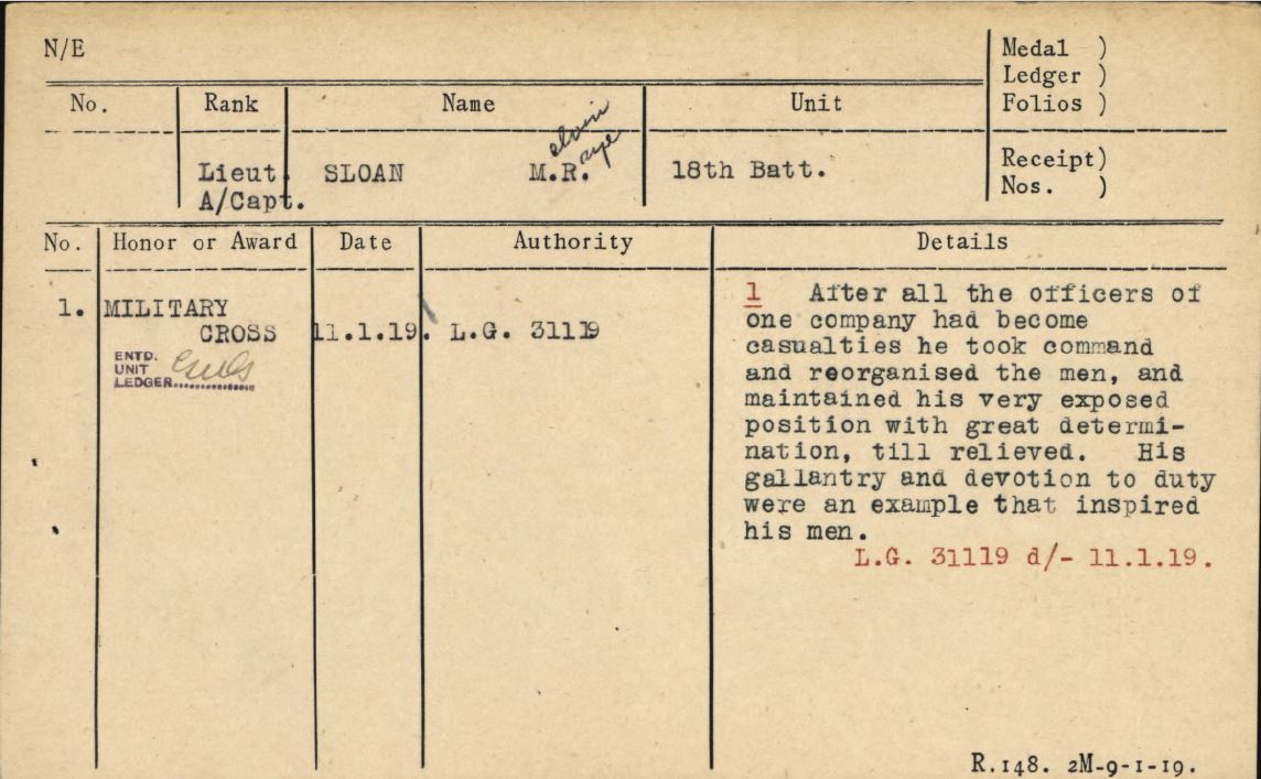 After all the officers of one company had become casualties he took command and reorganized the men, and maintained his very exposed position with great determination, till relieved. His gallantry and devotion to duty were an example that inspired his men.