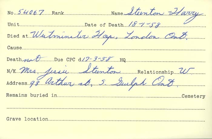 Family Search: Private Harry Steenton was born on 29 June 1881, in Shropshire, England, United Kingdom. He married Jessie Alice Lester in 1905, in Bridgnorth, Shropshire, England, United Kingdom. They were the parents of at least 2 sons and 1 daughter. He immigrated to Canada in 1913 and lived in Guelph, Wellington, Ontario, Canada for about 7 years. He registered for military service in 1914. In 1914, at the age of 33, his occupation is listed as carpet weaver in Guelph, Wellington, Ontario, Canada. He died on 18 January 1958, in London, Ontario, Canada, at the age of 76, and was buried in Woodlawn Memorial Park, Guelph, Wellington, Ontario, Canada.