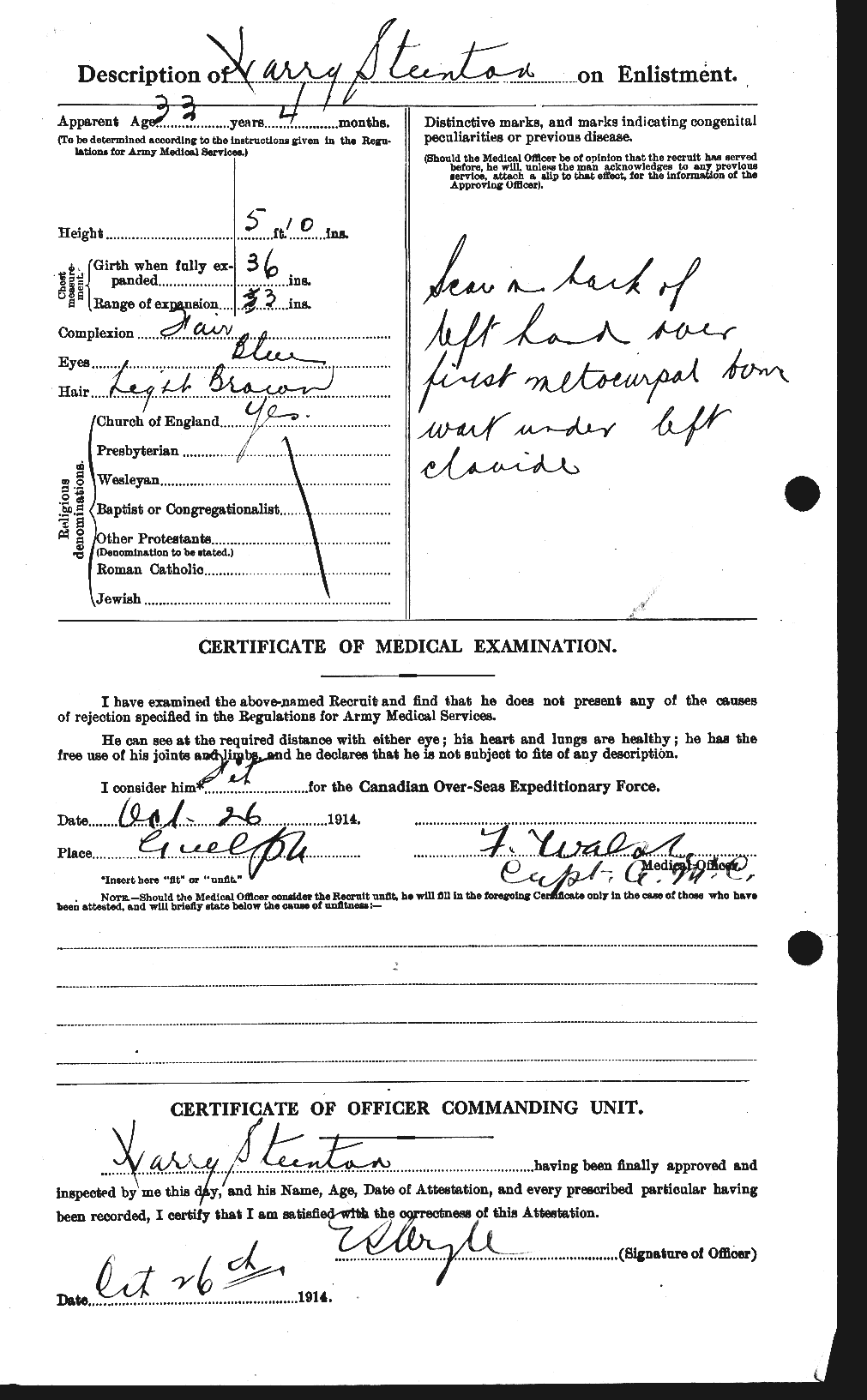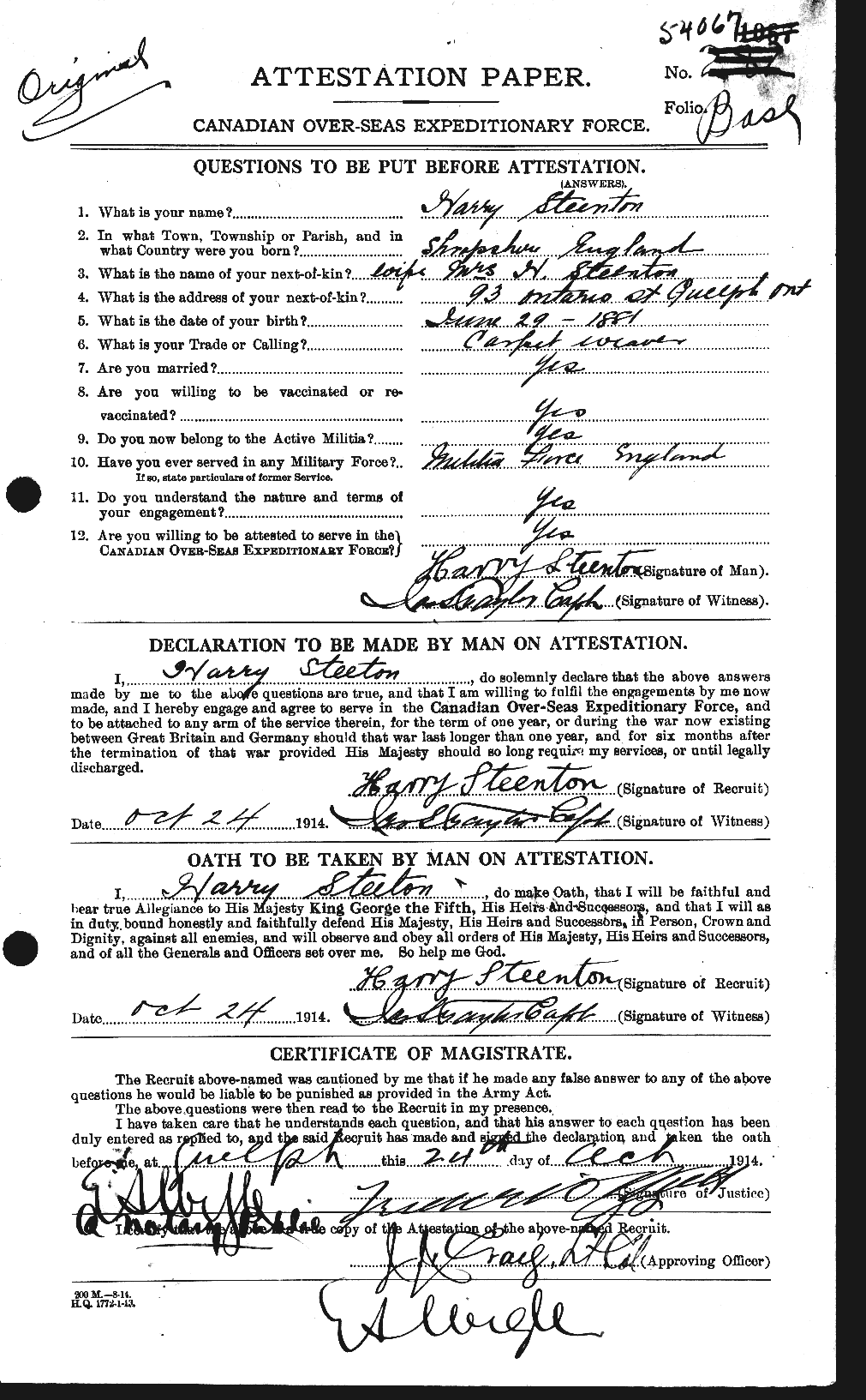 Family Search: Private Harry Steenton was born on 29 June 1881, in Shropshire, England, United Kingdom. He married Jessie Alice Lester in 1905, in Bridgnorth, Shropshire, England, United Kingdom. They were the parents of at least 2 sons and 1 daughter. He immigrated to Canada in 1913 and lived in Guelph, Wellington, Ontario, Canada for about 7 years. He registered for military service in 1914. In 1914, at the age of 33, his occupation is listed as carpet weaver in Guelph, Wellington, Ontario, Canada. He died on 18 January 1958, in London, Ontario, Canada, at the age of 76, and was buried in Woodlawn Memorial Park, Guelph, Wellington, Ontario, Canada.