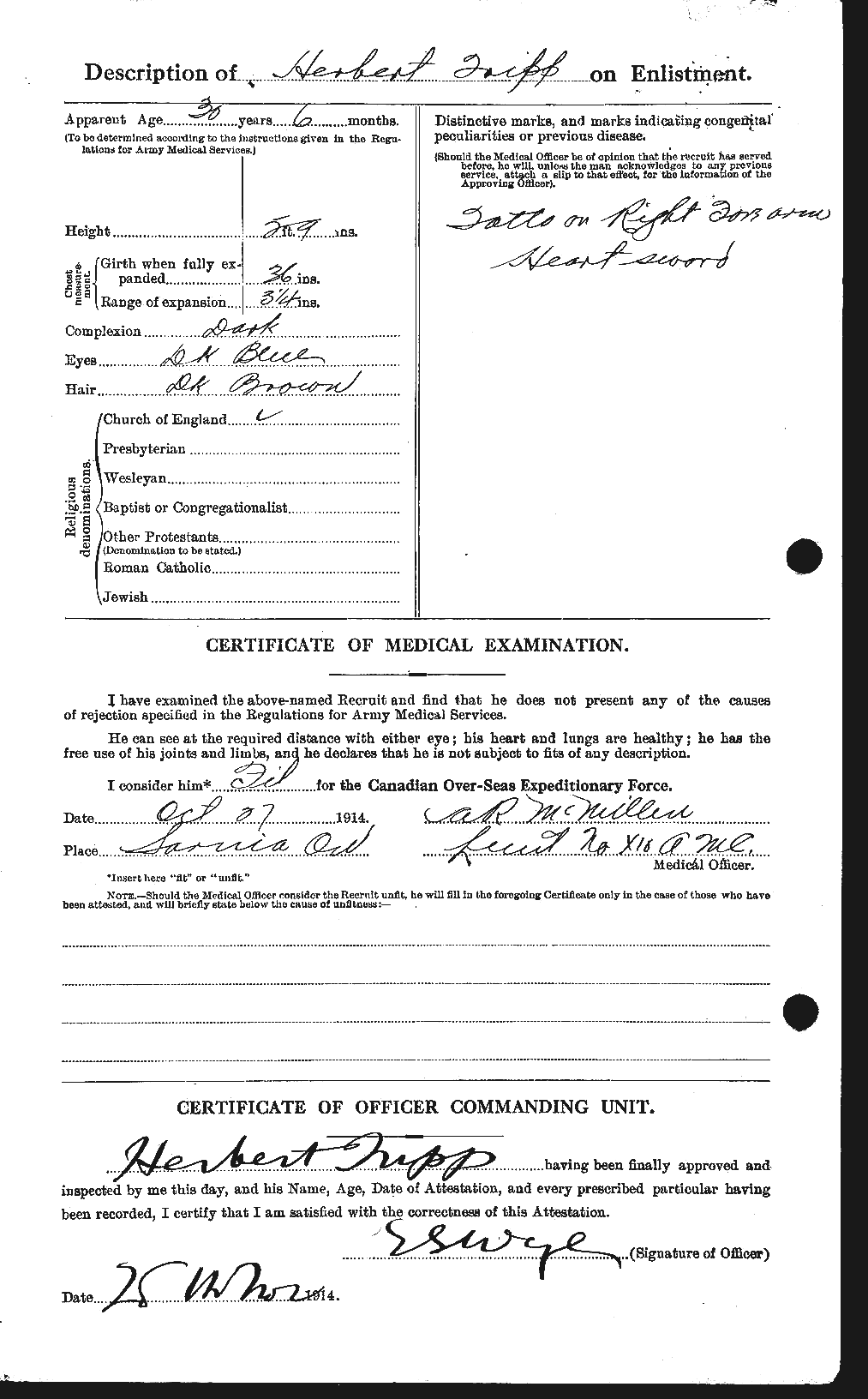 Family Search: When Sergeant Herbert Tripp was born on 25 April 1884, in Winchester Township, Stormont Dundas and Glengarry, Ontario, Canada, his father, Archibald Joseph Tripp, was 32 and his mother, Amelia Barringer, was 22. He had at least 2 sons and 4 daughters with Agnes Dickie Clark. He lived in Sarnia, Lambton, Ontario, Canada in 1921. He registered for military service in 1914. In 1914, at the age of 30, his occupation is listed as chef. He died on 7 December 1965, in London, Ontario, Canada, at the age of 81, and was buried in Woodland Cemetery, London, Ontario, Canada.