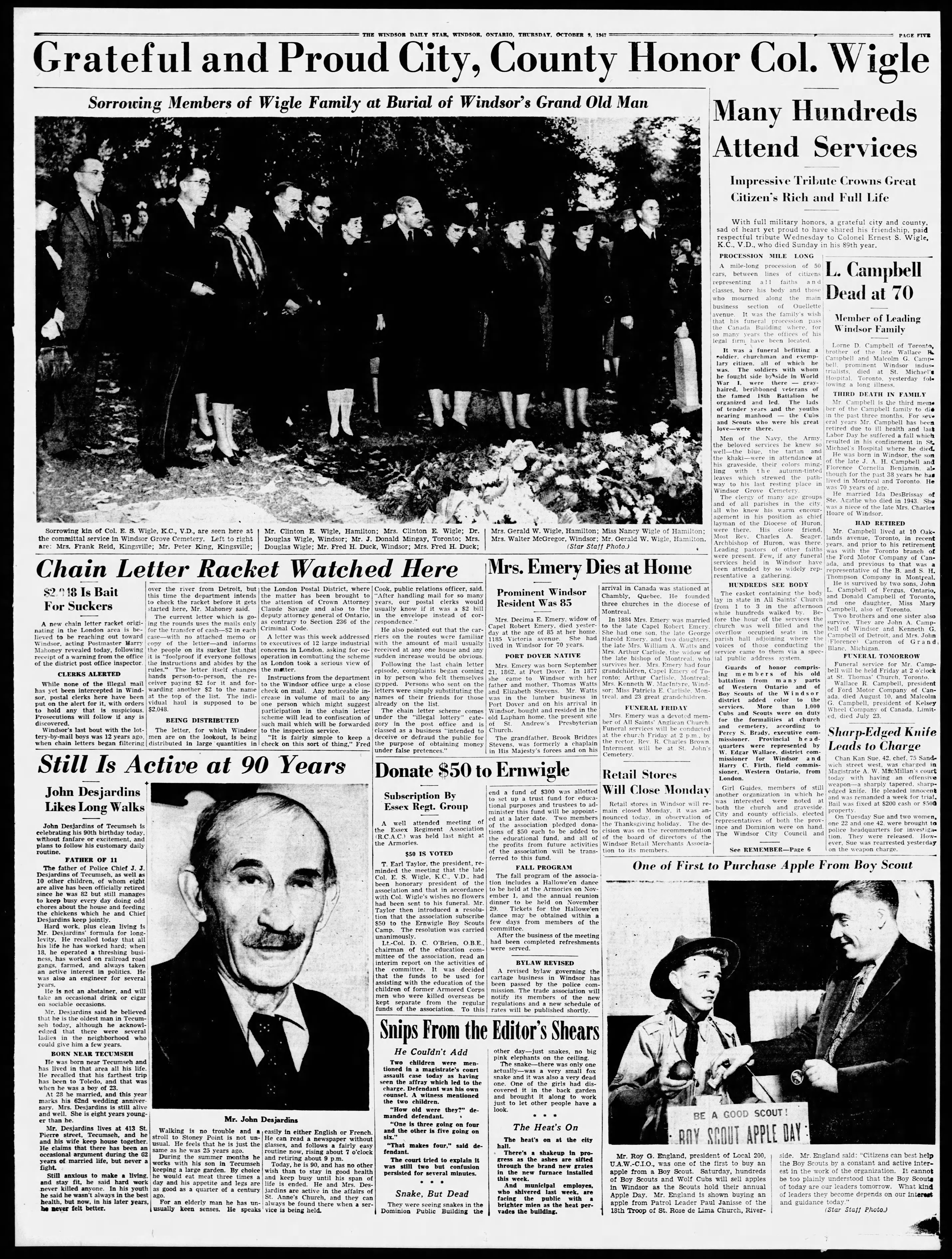Colonel Wigle, B.A., K.C., V.D., was born March 5, 1859, in the Township of Gosfield South, Essex County, and is the son of Solomon Wigle, ex-M.P. and Ann Iler. He worked on his father’s farm until he was 17, then began his education spending one year at the Kingsville Public School and two years at Galt Collegiate Institute before entering Toronto University, where he graduated in the Honor Course of Mental and Moral philosophy and Civil Polity in 1884. He proceeded to Osgoode Hall to study law and before being admitted to the Bar, married Alice M. Hirons, the daughter of the late William B. Hirons, of the City of Windsor. In 1887 he completed his course in law, was called to the Bar and began practice in Windsor. In the years that followed he had enjoyed enviable success, both in general practice and counsel work, the latter field taking in all the Courts of Canada and the Judicial Committee of the Privy Council of England.